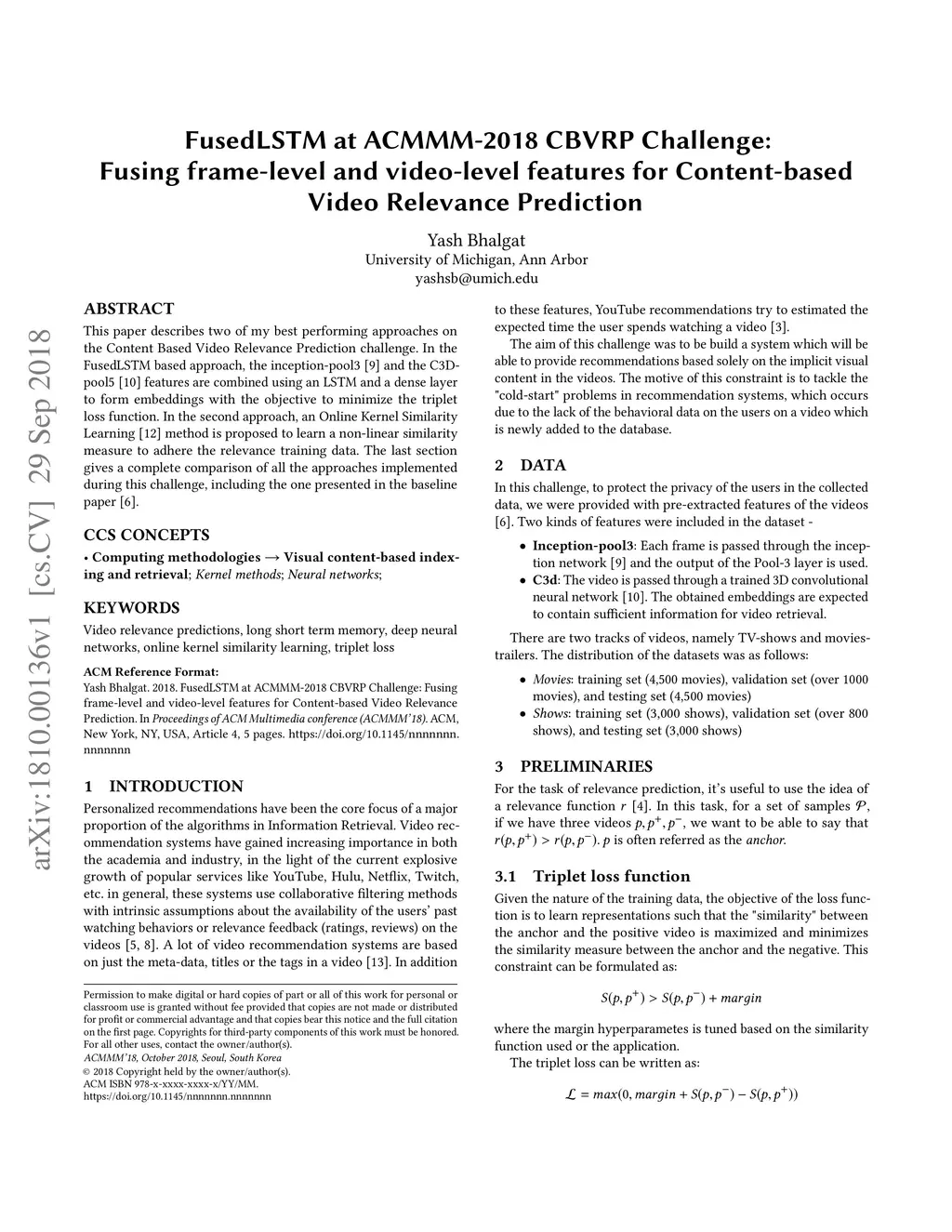 This paper describes two of my best performing approaches on the Content-based Video Relevance Prediction challenge. In the FusedLSTM based approach, the inception-pool3 and the C3D-pool5 features are combined using an LSTM and a dense layer to form embeddings with the objective to minimize the triplet loss function. In the second approach, an Online Kernel Similarity Learning method is proposed to learn a non-linear similarity measure to adhere the relevance training data. The last section gives a complete comparison of all the approaches implemented during this challenge, including the one presented in the baseline paper.
