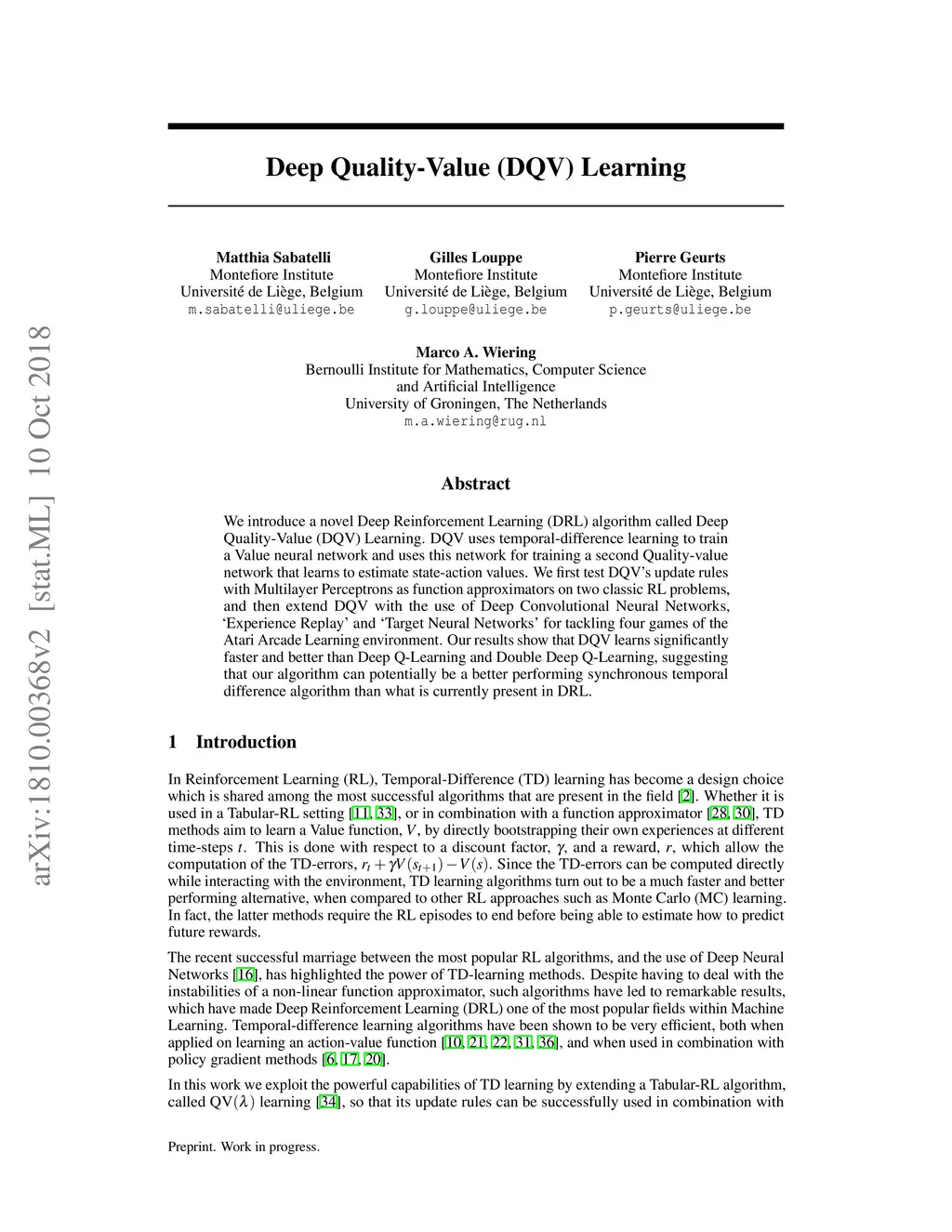 We introduce a novel Deep Reinforcement Learning (DRL) algorithm called Deep Quality-Value (DQV) Learning. Similarly to Advantage-Actor-Critic methods, DQV uses a Value neural network for estimating the temporal-difference errors which are then used by a second Quality network for directly learning the state-action values. We first test DQV's update rules with Multilayer Perceptrons as function approximators on two classic RL problems, and then extend DQV with the use of Deep Convolutional Neural Networks, `Experience Replay' and `Target Neural Networks' for tackling four games of the Atari Arcade Learning environment. Our results show that DQV learns significantly faster and better than Deep Q-Learning and Double Deep Q-Learning, suggesting that our algorithm can potentially be a better performing synchronous temporal difference algorithm than what is currently present in DRL.