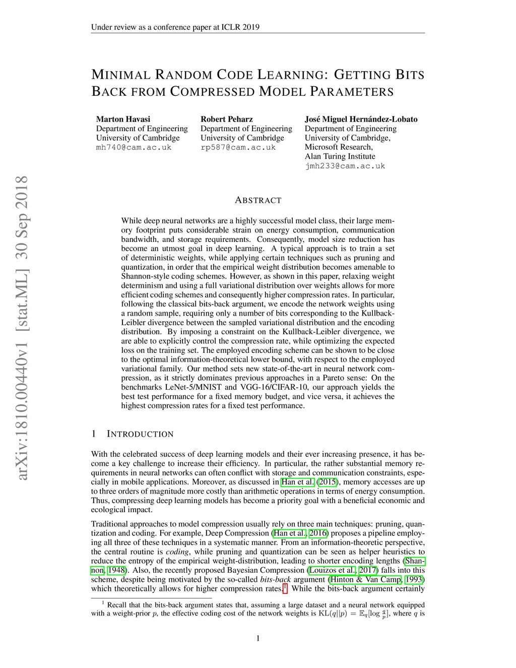 Minimal Random Code Learning: Getting Bits Back from Compressed Model