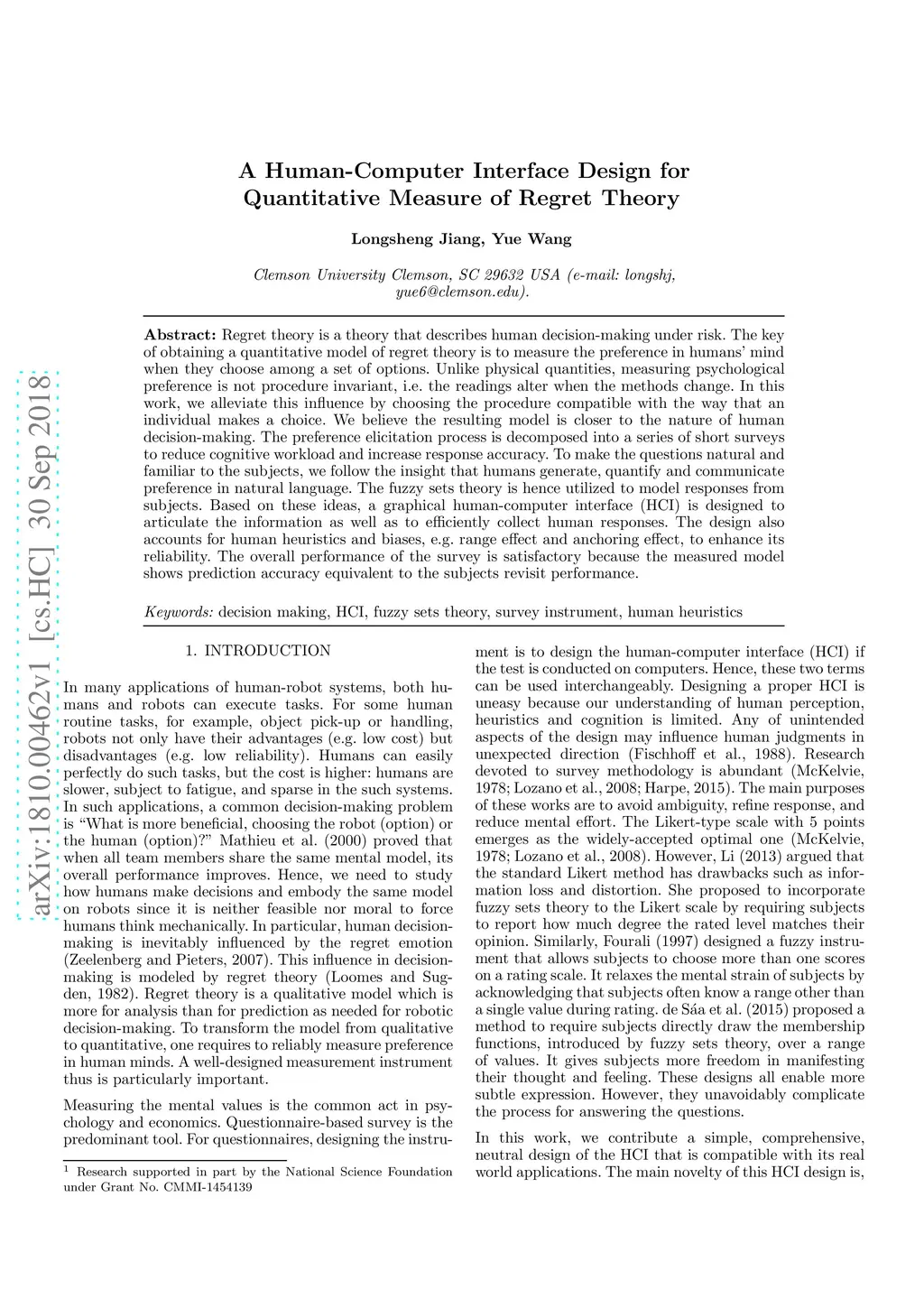 Regret theory is a theory that describes human decision-making under risk. The key of obtaining a quantitative model of regret theory is to measure the preference in humans' mind when they choose among a set of options. Unlike physical quantities, measuring psychological preference is not procedure invariant, i.e. the readings alter when the methods change. In this work, we alleviate this influence by choosing the procedure compatible with the way that an individual makes a choice. We believe the resulting model is closer to the nature of human decision-making. The preference elicitation process is decomposed into a series of short surveys to reduce cognitive workload and increase response accuracy. To make the questions natural and familiar to the subjects, we follow the insight that humans generate, quantify and communicate preference in natural language. The fuzzy-set theory is hence utilized to model responses from subjects. Based on these ideas, a graphical human-computer interface (HCI) is designed to articulate the information as well as to efficiently collect human responses. The design also accounts for human heuristics and biases, e.g. range effect and anchoring effect, to enhance its reliability. The overall performance of the survey is satisfactory because the measured model shows prediction accuracy equivalent to the revisit-performance of the subjects.