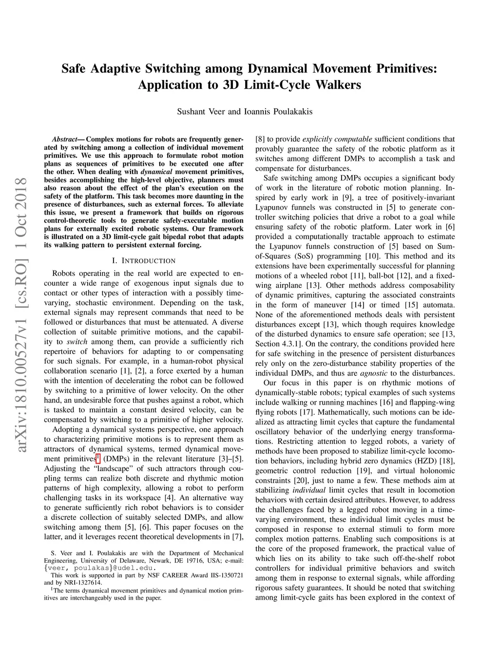 Complex motions for robots are frequently generated by switching among a collection of individual movement primitives. We use this approach to formulate robot motion plans as sequences of primitives to be executed one after the other. When dealing with dynamical movement primitives, besides accomplishing the high-level objective, planners must also reason about the effect of the plan's execution on the safety of the platform. This task becomes more daunting in the presence of disturbances, such as external forces. To alleviate this issue, we present a framework that builds on rigorous control-theoretic tools to generate safely-executable motion plans for externally excited robotic systems. Our framework is illustrated on a 3D limit-cycle gait bipedal robot that adapts its walking pattern to persistent external forcing.