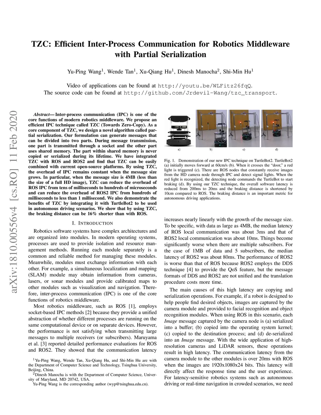 Inter-process communication (IPC) is one of the core functions of modern robotics middleware. We propose an efficient IPC technique called TZC (Towards Zero-Copy). As a core component of TZC, we design a novel algorithm called partial serialization. Our formulation can generate messages that can be divided into two parts. During message transmission, one part is transmitted through a socket and the other part uses shared memory. The part within shared memory is never copied or serialized during its lifetime. We have integrated TZC with ROS and ROS2 and find that TZC can be easily combined with current open-source platforms. By using TZC, the overhead of IPC remains constant when the message size grows. In particular, when the message size is 4MB (less than the size of a full HD image), TZC can reduce the overhead of ROS IPC from tens of milliseconds to hundreds of microseconds and can reduce the overhead of ROS2 IPC from hundreds of milliseconds to less than 1 millisecond. We also demonstrate the benefits of TZC by integrating with TurtleBot2 that are used in autonomous driving scenarios. We show that by using TZC, the braking distance can be shortened by 16% than ROS.