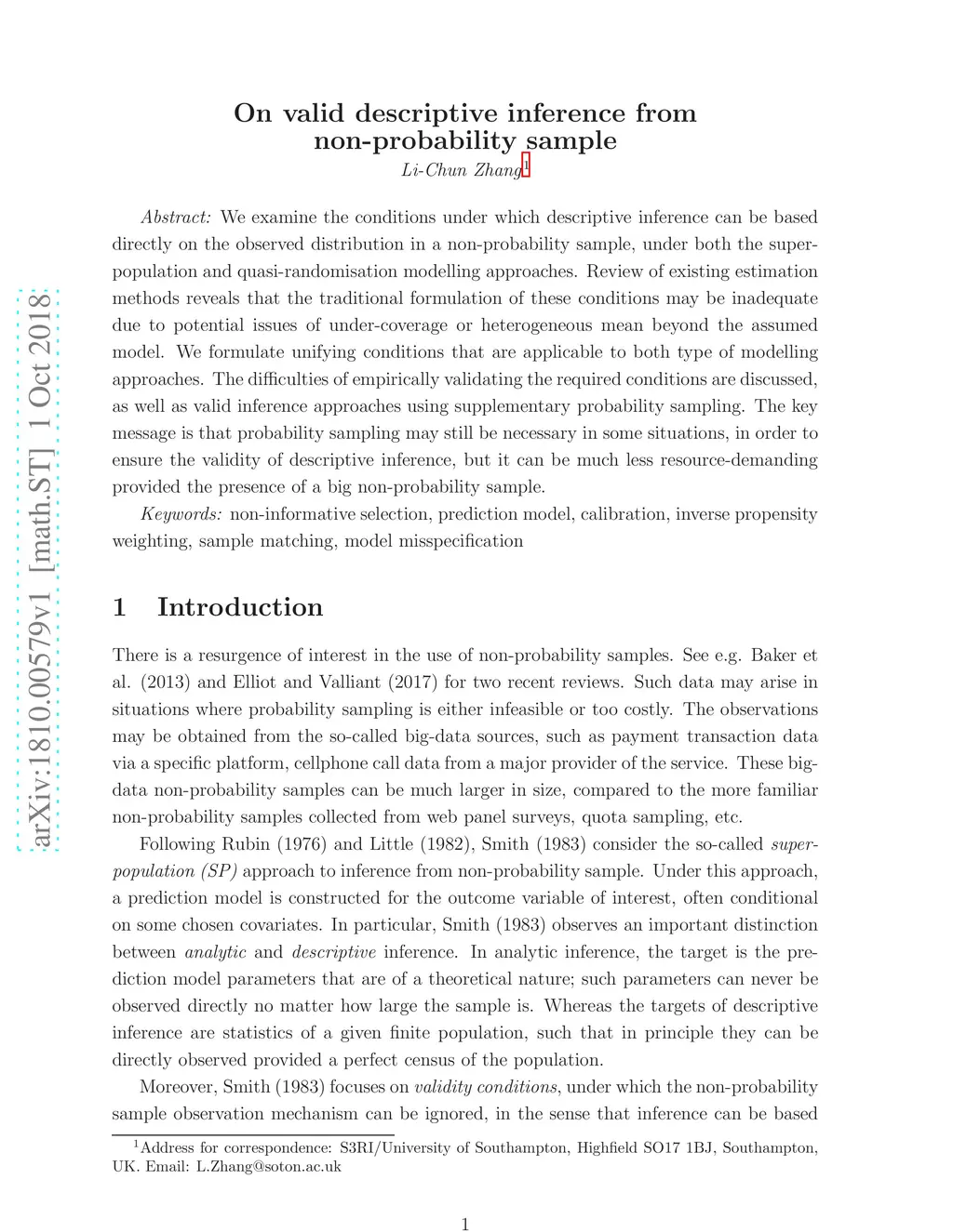 We examine the conditions under which descriptive inference can be based directly on the observed distribution in a non-probability sample, under both the super-population and quasi-randomisation modelling approaches. Review of existing estimation methods reveals that the traditional formulation of these conditions may be inadequate due to potential issues of under-coverage or heterogeneous mean beyond the assumed model. We formulate unifying conditions that are applicable to both type of modelling approaches. The difficulties of empirically validating the required conditions are discussed, as well as valid inference approaches using supplementary probability sampling. The key message is that probability sampling may still be necessary in some situations, in order to ensure the validity of descriptive inference, but it can be much less resource-demanding provided the presence of a big non-probability sample.