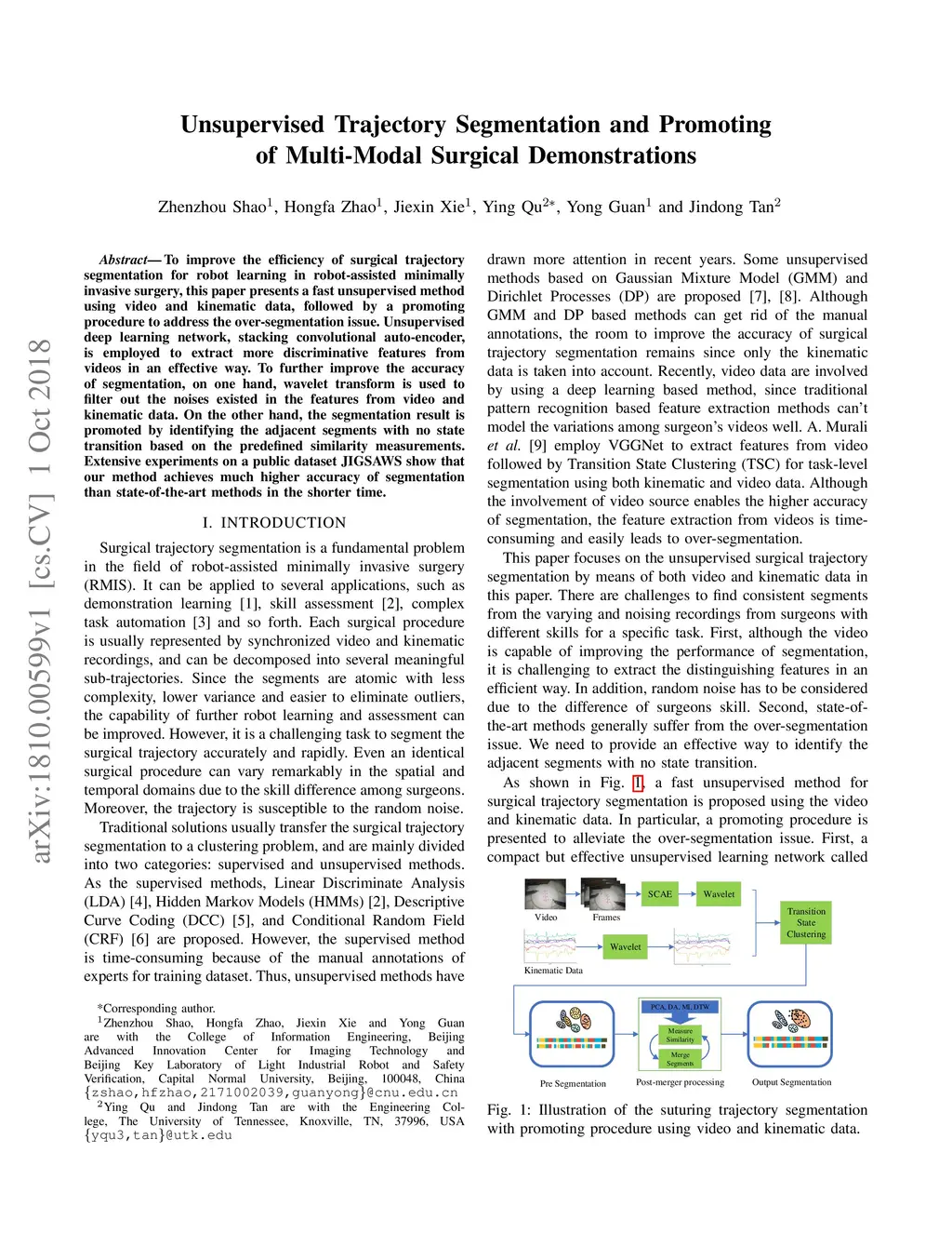 To improve the efficiency of surgical trajectory segmentation for robot learning in robot-assisted minimally invasive surgery, this paper presents a fast unsupervised method using video and kinematic data, followed by a promoting procedure to address the over-segmentation issue. Unsupervised deep learning network, stacking convolutional auto-encoder, is employed to extract more discriminative features from videos in an effective way. To further improve the accuracy of segmentation, on one hand, wavelet transform is used to filter out the noises existed in the features from video and kinematic data. On the other hand, the segmentation result is promoted by identifying the adjacent segments with no state transition based on the predefined similarity measurements. Extensive experiments on a public dataset JIGSAWS show that our method achieves much higher accuracy of segmentation than state-of-the-art methods in the shorter time.