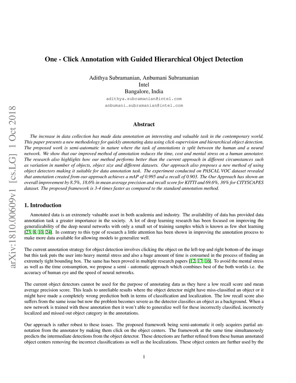 The increase in data collection has made data annotation an interesting and valuable task in the contemporary world. This paper presents a new methodology for quickly annotating data using click-supervision and hierarchical object detection. The proposed work is semi-automatic in nature where the task of annotations is split between the human and a neural network. We show that our improved method of annotation reduces the time, cost and mental stress on a human annotator. The research also highlights how our method performs better than the current approach in different circumstances such as variation in number of objects, object size and different datasets. Our approach also proposes a new method of using object detectors making it suitable for data annotation task. The experiment conducted on PASCAL VOC dataset revealed that annotation created from our approach achieves a mAP of 0.995 and a recall of 0.903. The Our Approach has shown an overall improvement by 8.5%, 18.6% in mean average precision and recall score for KITTI and 69.6%, 36% for CITYSCAPES dataset. The proposed framework is 3-4 times faster as compared to the standard annotation method.