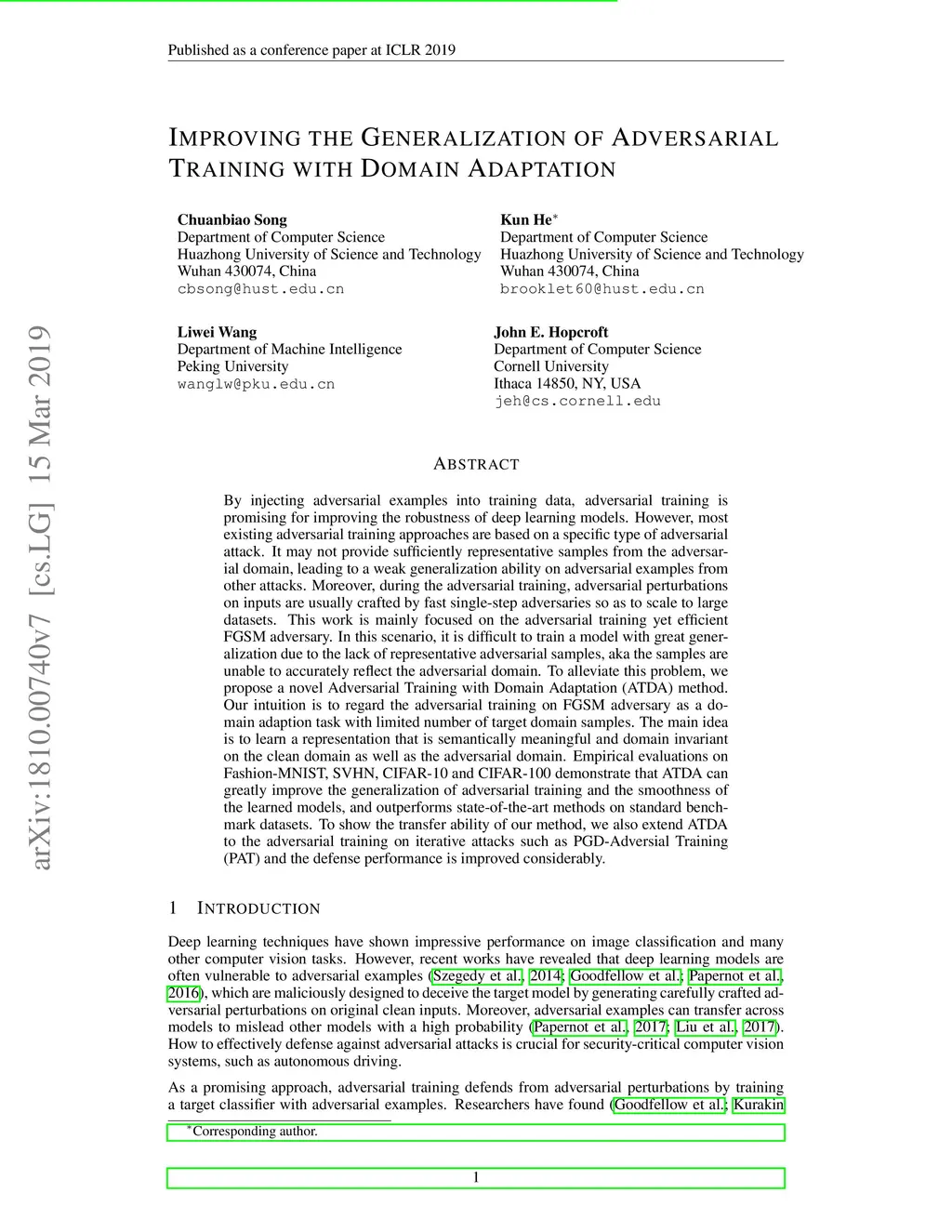 By injecting adversarial examples into training data, adversarial training is promising for improving the robustness of deep learning models. However, most existing adversarial training approaches are based on a specific type of adversarial attack. It may not provide sufficiently representative samples from the adversarial domain, leading to a weak generalization ability on adversarial examples from other attacks. Moreover, during the adversarial training, adversarial perturbations on inputs are usually crafted by fast single-step adversaries so as to scale to large datasets. This work is mainly focused on the adversarial training yet efficient FGSM adversary. In this scenario, it is difficult to train a model with great generalization due to the lack of representative adversarial samples, aka the samples are unable to accurately reflect the adversarial domain. To alleviate this problem, we propose a novel Adversarial Training with Domain Adaptation (ATDA) method. Our intuition is to regard the adversarial training on FGSM adversary as a domain adaption task with limited number of target domain samples. The main idea is to learn a representation that is semantically meaningful and domain invariant on the clean domain as well as the adversarial domain. Empirical evaluations on Fashion-MNIST, SVHN, CIFAR-10 and CIFAR-100 demonstrate that ATDA can greatly improve the generalization of adversarial training and the smoothness of the learned models, and outperforms state-of-the-art methods on standard benchmark datasets. To show the transfer ability of our method, we also extend ATDA to the adversarial training on iterative attacks such as PGD-Adversial Training (PAT) and the defense performance is improved considerably.