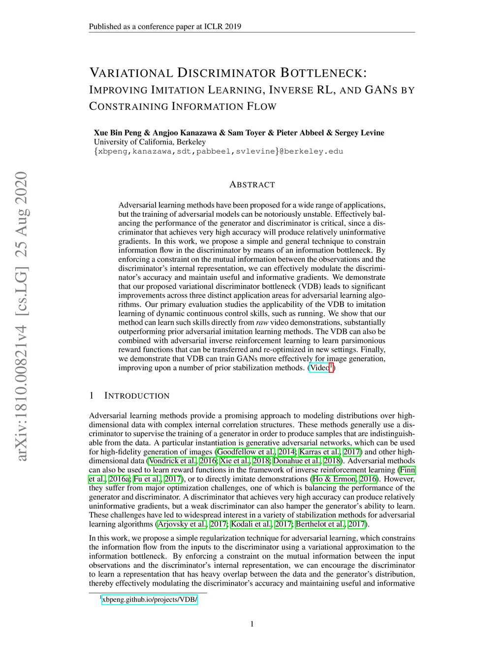 Adversarial learning methods have been proposed for a wide range of applications, but the training of adversarial models can be notoriously unstable. Effectively balancing the performance of the generator and discriminator is critical, since a discriminator that achieves very high accuracy will produce relatively uninformative gradients. In this work, we propose a simple and general technique to constrain information flow in the discriminator by means of an information bottleneck. By enforcing a constraint on the mutual information between the observations and the discriminator's internal representation, we can effectively modulate the discriminator's accuracy and maintain useful and informative gradients. We demonstrate that our proposed variational discriminator bottleneck (VDB) leads to significant improvements across three distinct application areas for adversarial learning algorithms. Our primary evaluation studies the applicability of the VDB to imitation learning of dynamic continuous control skills, such as running. We show that our method can learn such skills directly from \emph{raw} video demonstrations, substantially outperforming prior adversarial imitation learning methods. The VDB can also be combined with adversarial inverse reinforcement learning to learn parsimonious reward functions that can be transferred and re-optimized in new settings. Finally, we demonstrate that VDB can train GANs more effectively for image generation, improving upon a number of prior stabilization methods.