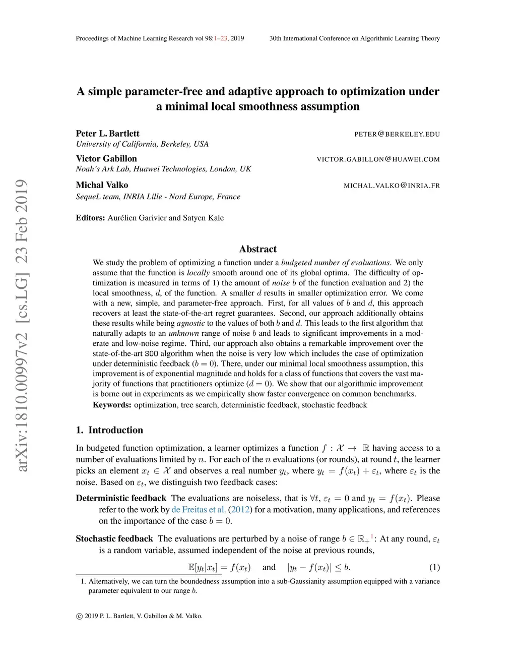 We study the problem of optimizing a function under a \emph{budgeted number of evaluations}. We only assume that the function is \emph{locally} smooth around one of its global optima. The difficulty of optimization is measured in terms of 1) the amount of \emph{noise} of the function evaluation and 2) the local smoothness, , of the function. A smaller results in smaller optimization error. We come with a new, simple, and parameter-free approach. First, for all values of and , this approach recovers at least the state-of-the-art regret guarantees. Second, our approach additionally obtains these results while being \textit{agnostic} to the values of both and . This leads to the first algorithm that naturally adapts to an \textit{unknown} range of noise and leads to significant improvements in a moderate and low-noise regime. Third, our approach also obtains a remarkable improvement over the state-of-the-art SOO algorithm when the noise is very low which includes the case of optimization under deterministic feedback (). There, under our minimal local smoothness assumption, this improvement is of exponential magnitude and holds for a class of functions that covers the vast majority of functions that practitioners optimize (). We show that our algorithmic improvement is borne out in experiments as we empirically show faster convergence on common benchmarks.