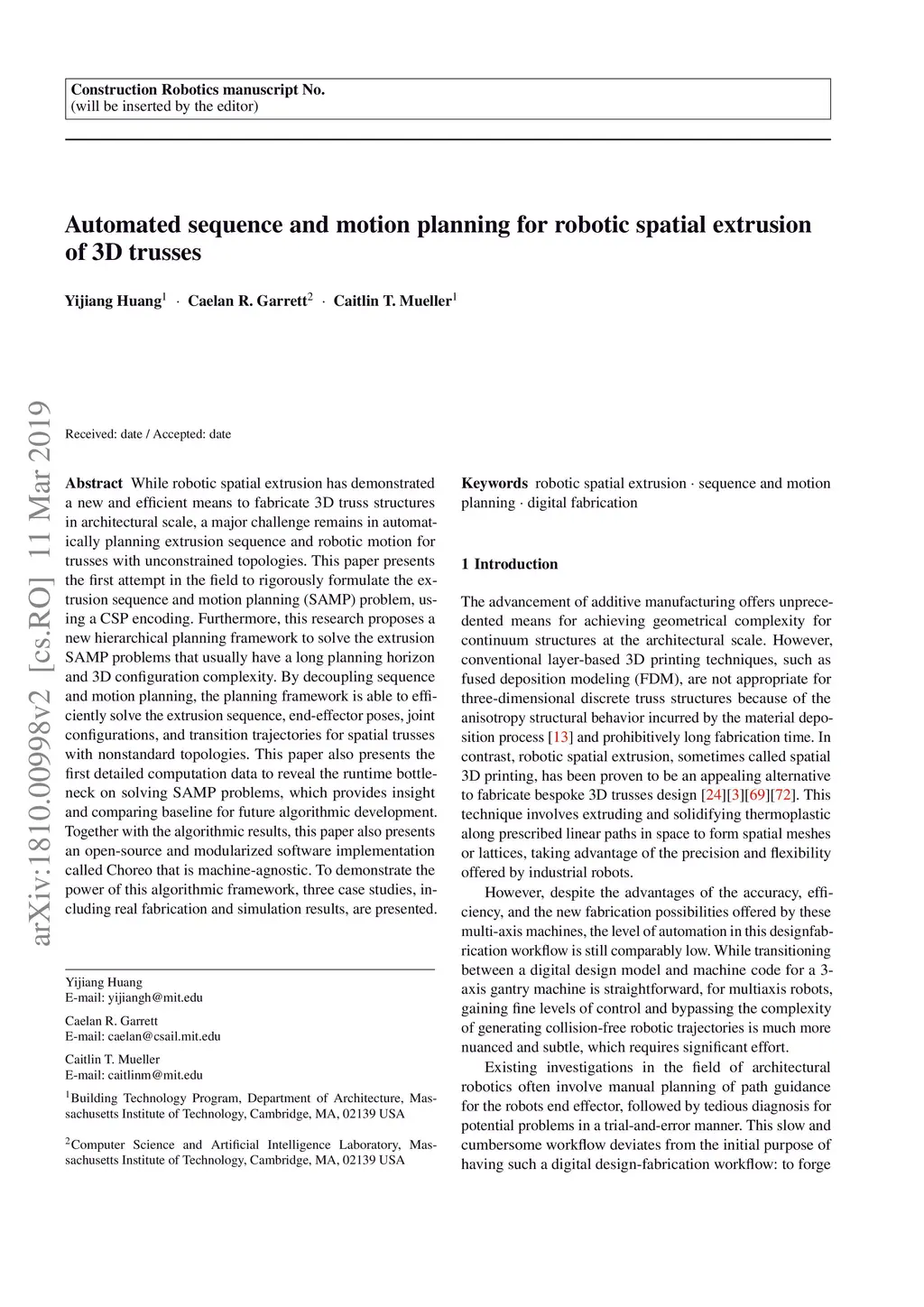 Automated sequence and motion planning for robotic spatial extrusion of