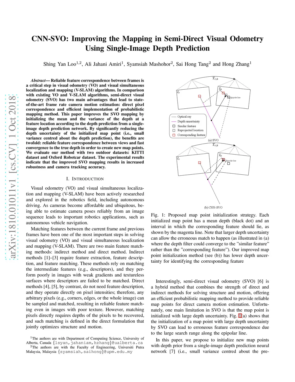 Reliable feature correspondence between frames is a critical step in visual odometry (VO) and visual simultaneous localization and mapping (V-SLAM) algorithms. In comparison with existing VO and V-SLAM algorithms, semi-direct visual odometry (SVO) has two main advantages that lead to state-of-the-art frame rate camera motion estimation: direct pixel correspondence and efficient implementation of probabilistic mapping method. This paper improves the SVO mapping by initializing the mean and the variance of the depth at a feature location according to the depth prediction from a single-image depth prediction network. By significantly reducing the depth uncertainty of the initialized map point (i.e., small variance centred about the depth prediction), the benefits are twofold: reliable feature correspondence between views and fast convergence to the true depth in order to create new map points. We evaluate our method with two outdoor datasets: KITTI dataset and Oxford Robotcar dataset. The experimental results indicate that the improved SVO mapping results in increased robustness and camera tracking accuracy.