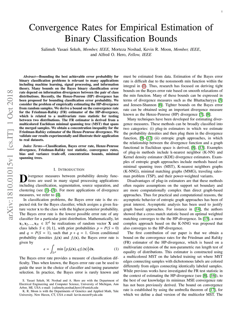 Bounding the best achievable error probability for binary classification problems is relevant to many applications including machine learning, signal processing, and information theory. Many bounds on the Bayes binary classification error rate depend on information divergences between the pair of class distributions. Recently, the Henze-Penrose (HP) divergence has been proposed for bounding classification error probability. We consider the problem of empirically estimating the HP-divergence from random samples. We derive a bound on the convergence rate for the Friedman-Rafsky (FR) estimator of the HP-divergence, which is related to a multivariate runs statistic for testing between two distributions. The FR estimator is derived from a multicolored Euclidean minimal spanning tree (MST) that spans the merged samples. We obtain a concentration inequality for the Friedman-Rafsky estimator of the Henze-Penrose divergence. We validate our results experimentally and illustrate their application to real datasets.