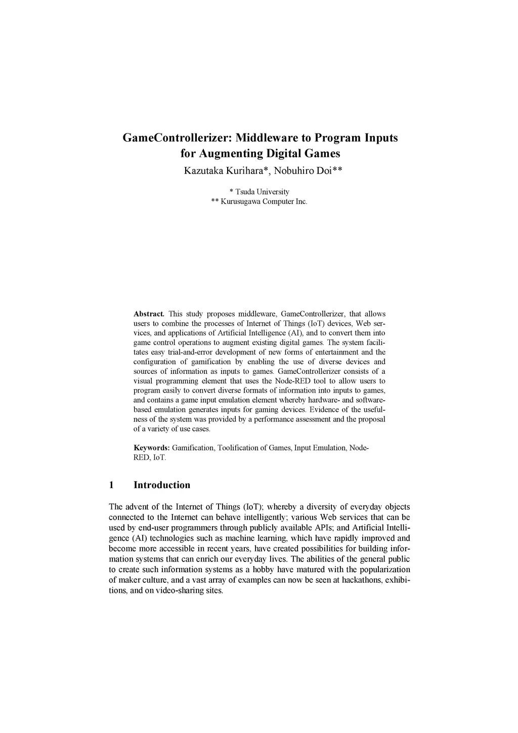 This study proposes middleware, GameControllerizer, that allows users to combine the processes of Internet of Things (IoT) devices, Web services, and applications of Artificial Intelligence (AI), and to convert them into game control operations to augment existing digital games. The system facilitates easy trial-and-error development of new forms of entertainment and the configuration of gamification by enabling the use of diverse devices and sources of information as inputs to games. GameControllerizer consists of a visual programming element that uses the Node-RED tool to allow users to program easily to convert diverse formats of information into inputs to games, and contains a game input emulation element whereby hardware- and software-based emulation generates inputs for gaming devices. Evidence of the usefulness of the system was provided by a performance assessment and the proposal of a variety of use cases.