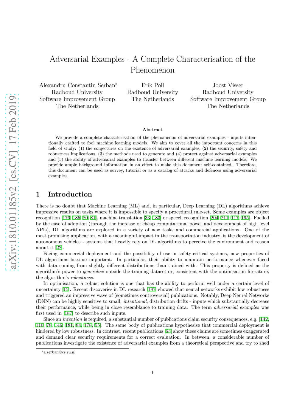 We provide a complete characterisation of the phenomenon of adversarial examples - inputs intentionally crafted to fool machine learning models. We aim to cover all the important concerns in this field of study: (1) the conjectures on the existence of adversarial examples, (2) the security, safety and robustness implications, (3) the methods used to generate and (4) protect against adversarial examples and (5) the ability of adversarial examples to transfer between different machine learning models. We provide ample background information in an effort to make this document self-contained. Therefore, this document can be used as survey, tutorial or as a catalog of attacks and defences using adversarial examples.