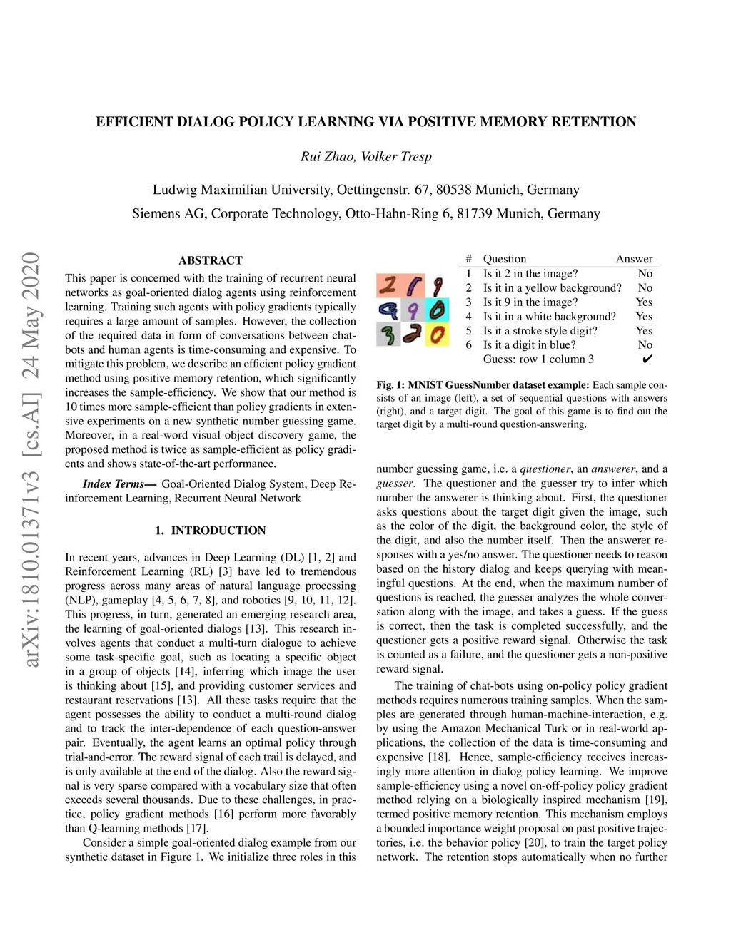 This paper is concerned with the training of recurrent neural networks as goal-oriented dialog agents using reinforcement learning. Training such agents with policy gradients typically requires a large amount of samples. However, the collection of the required data in form of conversations between chat-bots and human agents is time-consuming and expensive. To mitigate this problem, we describe an efficient policy gradient method using positive memory retention, which significantly increases the sample-efficiency. We show that our method is 10 times more sample-efficient than policy gradients in extensive experiments on a new synthetic number guessing game. Moreover, in a real-word visual object discovery game, the proposed method is twice as sample-efficient as policy gradients and shows state-of-the-art performance.