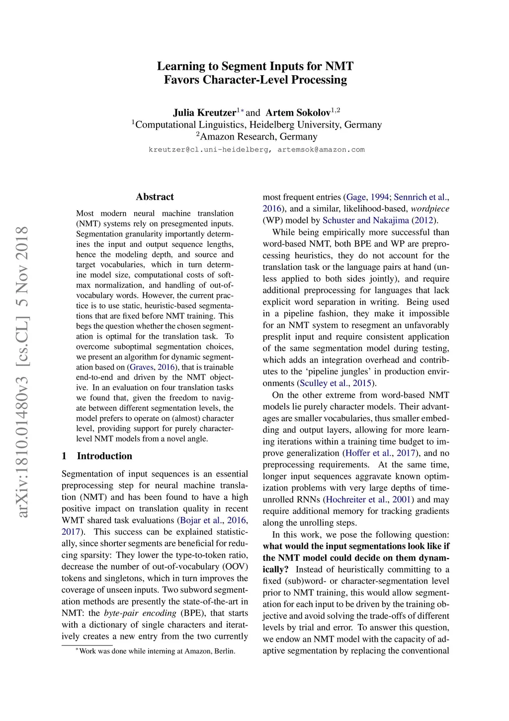 Most modern neural machine translation (NMT) systems rely on presegmented inputs. Segmentation granularity importantly determines the input and output sequence lengths, hence the modeling depth, and source and target vocabularies, which in turn determine model size, computational costs of softmax normalization, and handling of out-of-vocabulary words. However, the current practice is to use static, heuristic-based segmentations that are fixed before NMT training. This begs the question whether the chosen segmentation is optimal for the translation task. To overcome suboptimal segmentation choices, we present an algorithm for dynamic segmentation based on the Adaptative Computation Time algorithm (Graves 2016), that is trainable end-to-end and driven by the NMT objective. In an evaluation on four translation tasks we found that, given the freedom to navigate between different segmentation levels, the model prefers to operate on (almost) character level, providing support for purely character-level NMT models from a novel angle.