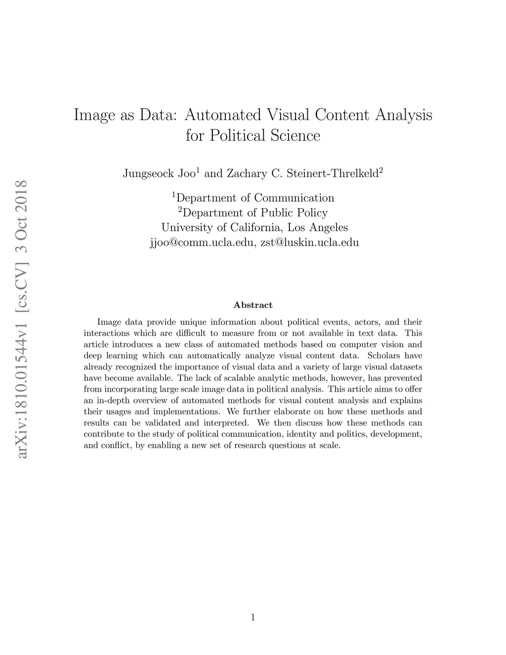 Image data provide unique information about political events, actors, and their interactions which are difficult to measure from or not available in text data. This article introduces a new class of automated methods based on computer vision and deep learning which can automatically analyze visual content data. Scholars have already recognized the importance of visual data and a variety of large visual datasets have become available. The lack of scalable analytic methods, however, has prevented from incorporating large scale image data in political analysis. This article aims to offer an in-depth overview of automated methods for visual content analysis and explains their usages and implementations. We further elaborate on how these methods and results can be validated and interpreted. We then discuss how these methods can contribute to the study of political communication, identity and politics, development, and conflict, by enabling a new set of research questions at scale.