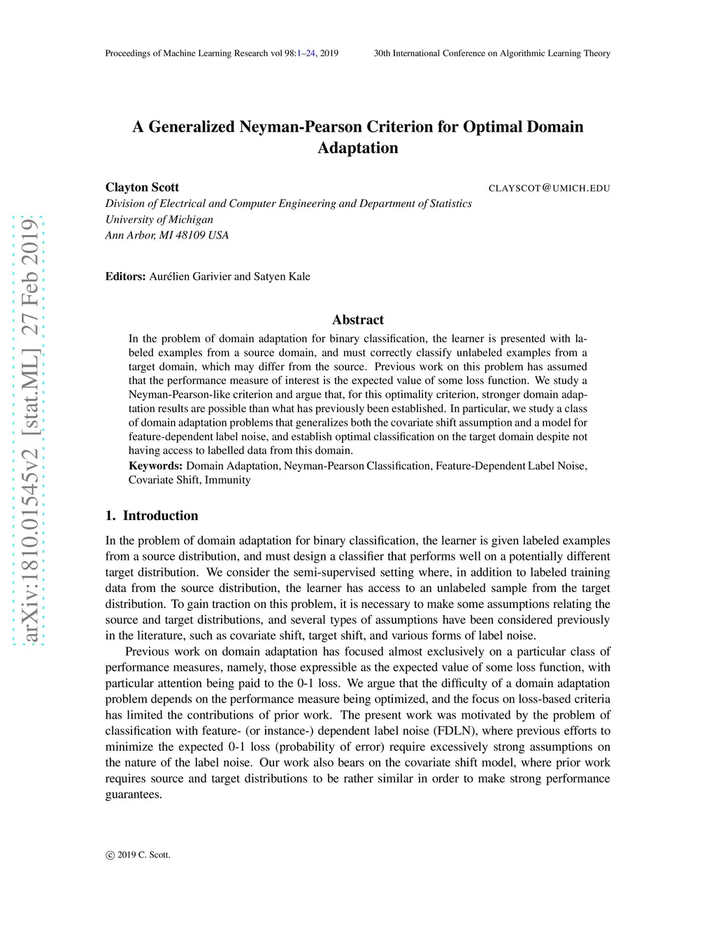 In the problem of domain adaptation for binary classification, the learner is presented with labeled examples from a source domain, and must correctly classify unlabeled examples from a target domain, which may differ from the source. Previous work on this problem has assumed that the performance measure of interest is the expected value of some loss function. We introduce a new Neyman-Pearson-like criterion and argue that, for this optimality criterion, stronger domain adaptation results are possible than what has previously been established. In particular, we study a class of domain adaptation problems that generalizes both the covariate shift assumption and a model for feature-dependent label noise, and establish optimal classification on the target domain despite not having access to labelled data from this domain.