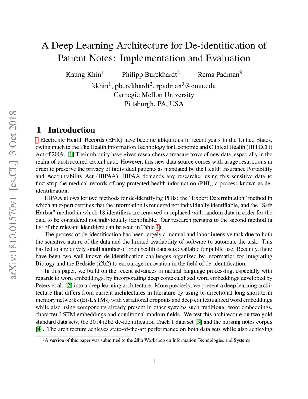 A Deep Learning Architecture for De-identification of Patient Notes: