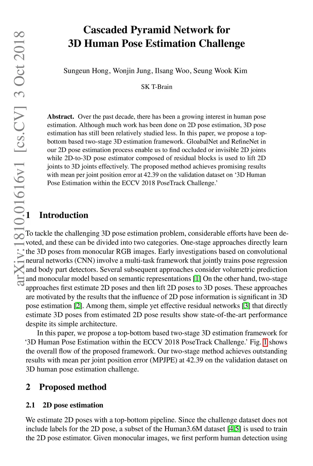 Over the past decade, there has been a growing interest in human pose estimation. Although much work has been done on 2D pose estimation, 3D pose estimation has still been relatively studied less. In this paper, we propose a top-bottom based two-stage 3D estimation framework. GloabalNet and RefineNet in our 2D pose estimation process enable us to find occluded or invisible 2D joints while 2D-to-3D pose estimator composed of residual blocks is used to lift 2D joints to 3D joints effectively. The proposed method achieves promising results with mean per joint position error at 42.39 on the validation dataset on `3D Human Pose Estimation within the ECCV 2018 PoseTrack Challenge.'