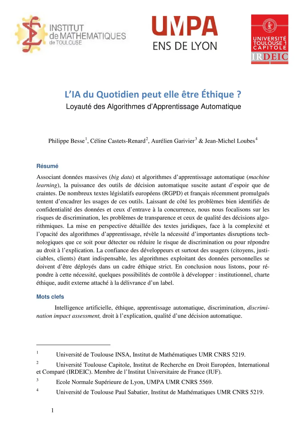 Combining big data and machine learning algorithms, the power of automatic decision tools induces as much hope as fear. Many recently enacted European legislation (GDPR) and French laws attempt to regulate the use of these tools. Leaving aside the well-identified problems of data confidentiality and impediments to competition, we focus on the risks of discrimination, the problems of transparency and the quality of algorithmic decisions. The detailed perspective of the legal texts, faced with the complexity and opacity of the learning algorithms, reveals the need for important technological disruptions for the detection or reduction of the discrimination risk, and for addressing the right to obtain an explanation of the auto- matic decision. Since trust of the developers and above all of the users (citizens, litigants, customers) is essential, algorithms exploiting personal data must be deployed in a strict ethical framework. In conclusion, to answer this need, we list some ways of controls to be developed: institutional control, ethical charter, external audit attached to the issue of a label.