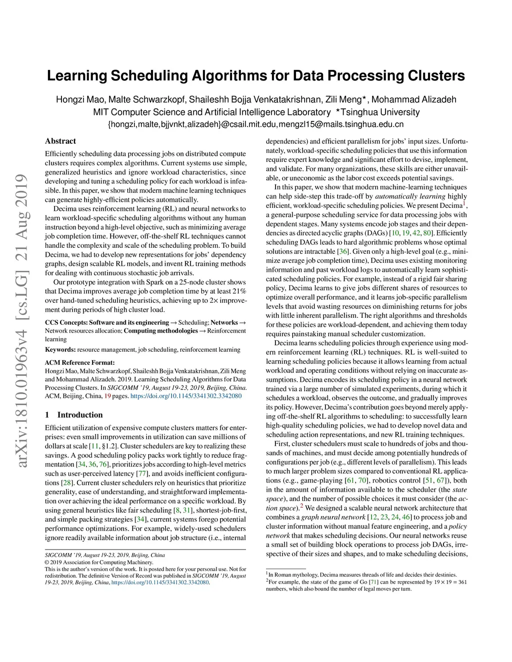 Efficiently scheduling data processing jobs on distributed compute clusters requires complex algorithms. Current systems, however, use simple generalized heuristics and ignore workload structure, since developing and tuning a bespoke heuristic for each workload is infeasible. In this paper, we show that modern machine learning techniques can generate highly-efficient policies automatically. Decima uses reinforcement learning (RL) and neural networks to learn workload-specific scheduling algorithms without any human instruction beyond specifying a high-level objective such as minimizing average job completion time. Off-the-shelf RL techniques, however, cannot handle the complexity and scale of the scheduling problem. To build Decima, we had to develop new representations for jobs' dependency graphs, design scalable RL models, and invent new RL training methods for continuous job arrivals. Our prototype integration with Spark on a 25-node cluster shows that Decima outperforms several heuristics, including hand-tuned ones, by at least 21%. Further experiments with an industrial production workload trace demonstrate that Decima delivers up to a 17% reduction in average job completion time and scales to large clusters.