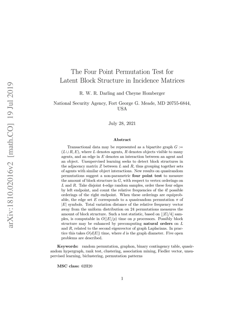Transactional data may be represented as a bipartite graph , where denotes agents, denotes objects visible to many agents, and an edge in denotes an interaction between an agent and an object. Unsupervised learning seeks to detect block structures in the adjacency matrix between and , thus grouping together sets of agents with similar object interactions. New results on quasirandom permutations suggest a non-parametric \textbf{four point test} to measure the amount of block structure in , with respect to vertex orderings on and . Take disjoint 4-edge random samples, order these four edges by left endpoint, and count the relative frequencies of the possible orderings of the right endpoint. When these orderings are equiprobable, the edge set corresponds to a quasirandom permutation of symbols. Total variation distance of the relative frequency vector away from the uniform distribution on 24 permutations measures the amount of block structure. Such a test statistic, based on samples, is computable in time on processors. Possibly block structure may be enhanced by precomputing \textbf{natural orders} on and , related to the second eigenvector of graph Laplacians. In practice this takes time, where is the graph diameter. Five open problems are described.