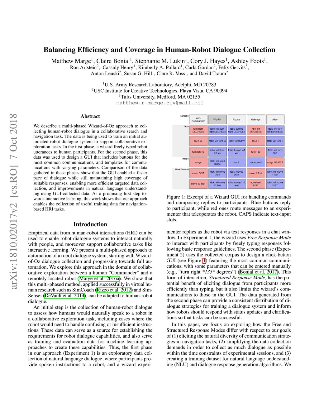 We describe a multi-phased Wizard-of-Oz approach to collecting human-robot dialogue in a collaborative search and navigation task. The data is being used to train an initial automated robot dialogue system to support collaborative exploration tasks. In the first phase, a wizard freely typed robot utterances to human participants. For the second phase, this data was used to design a GUI that includes buttons for the most common communications, and templates for communications with varying parameters. Comparison of the data gathered in these phases show that the GUI enabled a faster pace of dialogue while still maintaining high coverage of suitable responses, enabling more efficient targeted data collection, and improvements in natural language understanding using GUI-collected data. As a promising first step towards interactive learning, this work shows that our approach enables the collection of useful training data for navigation-based HRI tasks.
