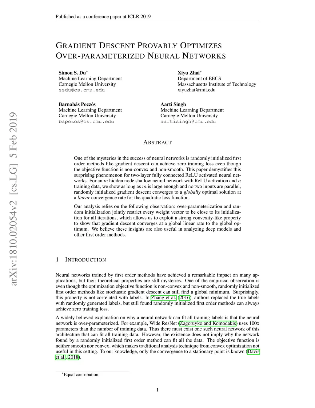 One of the mysteries in the success of neural networks is randomly initialized first order methods like gradient descent can achieve zero training loss even though the objective function is non-convex and non-smooth. This paper demystifies this surprising phenomenon for two-layer fully connected ReLU activated neural networks. For an hidden node shallow neural network with ReLU activation and training data, we show as long as is large enough and no two inputs are parallel, randomly initialized gradient descent converges to a globally optimal solution at a linear convergence rate for the quadratic loss function. Our analysis relies on the following observation: over-parameterization and random initialization jointly restrict every weight vector to be close to its initialization for all iterations, which allows us to exploit a strong convexity-like property to show that gradient descent converges at a global linear rate to the global optimum. We believe these insights are also useful in analyzing deep models and other first order methods.