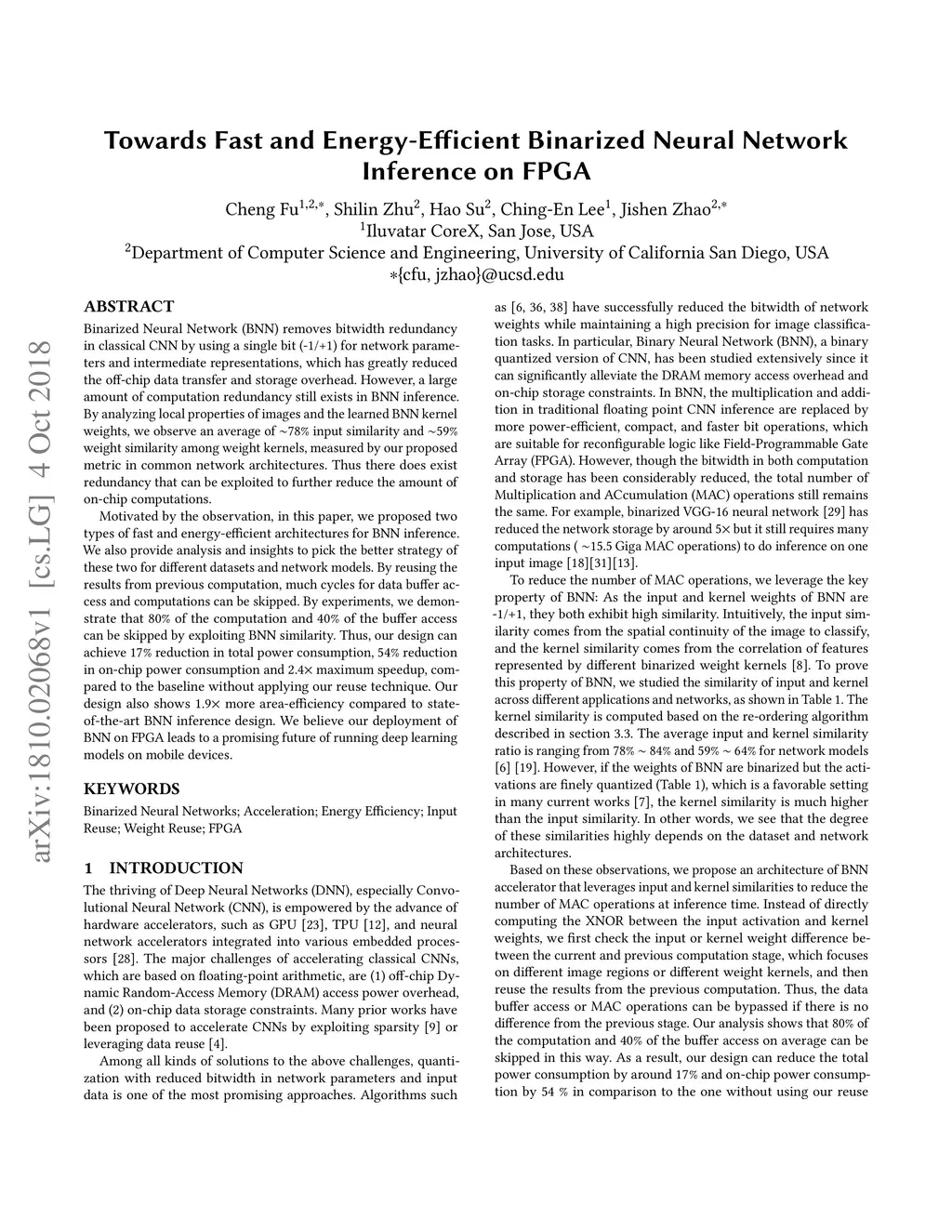 Binarized Neural Network (BNN) removes bitwidth redundancy in classical CNN by using a single bit (-1/+1) for network parameters and intermediate representations, which has greatly reduced the off-chip data transfer and storage overhead. However, a large amount of computation redundancy still exists in BNN inference. By analyzing local properties of images and the learned BNN kernel weights, we observe an average of 78% input similarity and 59% weight similarity among weight kernels, measured by our proposed metric in common network architectures. Thus there does exist redundancy that can be exploited to further reduce the amount of on-chip computations. Motivated by the observation, in this paper, we proposed two types of fast and energy-efficient architectures for BNN inference. We also provide analysis and insights to pick the better strategy of these two for different datasets and network models. By reusing the results from previous computation, much cycles for data buffer access and computations can be skipped. By experiments, we demonstrate that 80% of the computation and 40% of the buffer access can be skipped by exploiting BNN similarity. Thus, our design can achieve 17% reduction in total power consumption, 54% reduction in on-chip power consumption and 2.4 maximum speedup, compared to the baseline without applying our reuse technique. Our design also shows 1.9 more area-efficiency compared to state-of-the-art BNN inference design. We believe our deployment of BNN on FPGA leads to a promising future of running deep learning models on mobile devices.