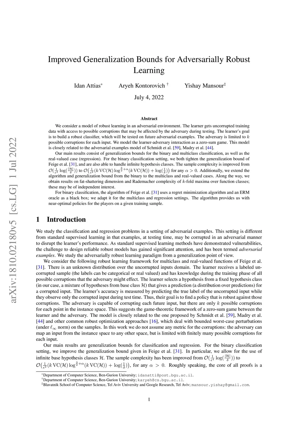 We consider a model of robust learning in an adversarial environment. The learner gets uncorrupted training data with access to possible corruptions that may be affected by the adversary during testing. The learner's goal is to build a robust classifier, which will be tested on future adversarial examples. The adversary is limited to possible corruptions for each input. We model the learner-adversary interaction as a zero-sum game. This model is closely related to the adversarial examples model of Schmidt et al. (2018); Madry et al. (2017). Our main results consist of generalization bounds for the binary and multiclass classification, as well as the real-valued case (regression). For the binary classification setting, we both tighten the generalization bound of Feige et al. (2015), and are also able to handle infinite hypothesis classes. The sample complexity is improved from to for any . Additionally, we extend the algorithm and generalization bound from the binary to the multiclass and real-valued cases. Along the way, we obtain results on fat-shattering dimension and Rademacher complexity of -fold maxima over function classes; these may be of independent interest. For binary classification, the algorithm of Feige et al. (2015) uses a regret minimization algorithm and an ERM oracle as a black box; we adapt it for the multiclass and regression settings. The algorithm provides us with near-optimal policies for the players on a given training sample.