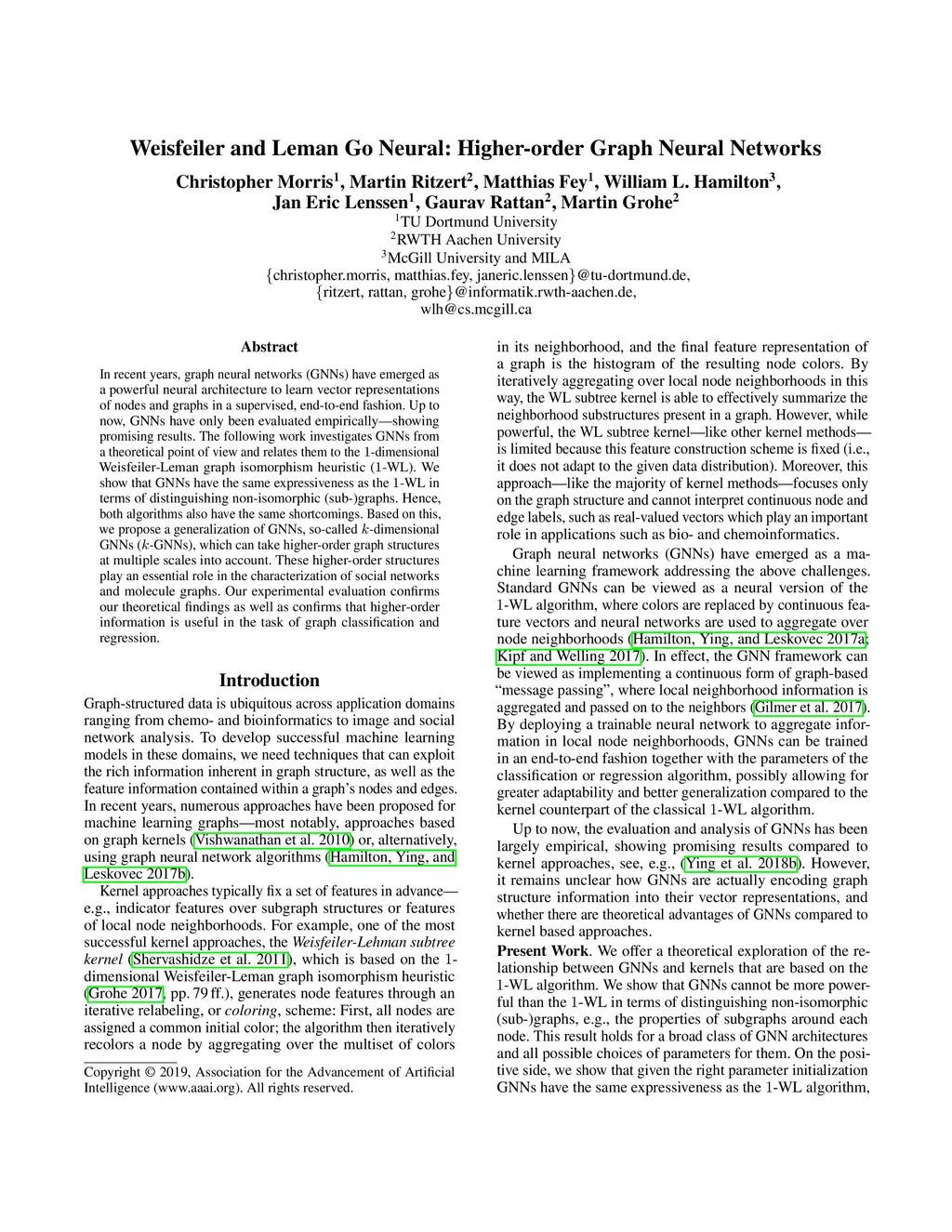 In recent years, graph neural networks (GNNs) have emerged as a powerful neural architecture to learn vector representations of nodes and graphs in a supervised, end-to-end fashion. Up to now, GNNs have only been evaluated empirically---showing promising results. The following work investigates GNNs from a theoretical point of view and relates them to the -dimensional Weisfeiler-Leman graph isomorphism heuristic (-WL). We show that GNNs have the same expressiveness as the -WL in terms of distinguishing non-isomorphic (sub-)graphs. Hence, both algorithms also have the same shortcomings. Based on this, we propose a generalization of GNNs, so-called -dimensional GNNs (-GNNs), which can take higher-order graph structures at multiple scales into account. These higher-order structures play an essential role in the characterization of social networks and molecule graphs. Our experimental evaluation confirms our theoretical findings as well as confirms that higher-order information is useful in the task of graph classification and regression.
