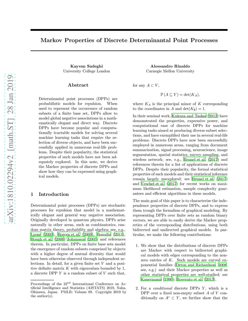 Determinantal point processes (DPPs) are probabilistic models for repulsion. When used to represent the occurrence of random subsets of a finite base set, DPPs allow to model global negative associations in a mathematically elegant and direct way. Discrete DPPs have become popular and computationally tractable models for solving several machine learning tasks that require the selection of diverse objects, and have been successfully applied in numerous real-life problems. Despite their popularity, the statistical properties of such models have not been adequately explored. In this note, we derive the Markov properties of discrete DPPs and show how they can be expressed using graphical models.