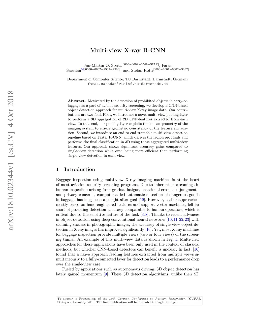 Motivated by the detection of prohibited objects in carry-on luggage as a part of avionic security screening, we develop a CNN-based object detection approach for multi-view X-ray image data. Our contributions are two-fold. First, we introduce a novel multi-view pooling layer to perform a 3D aggregation of 2D CNN-features extracted from each view. To that end, our pooling layer exploits the known geometry of the imaging system to ensure geometric consistency of the feature aggregation. Second, we introduce an end-to-end trainable multi-view detection pipeline based on Faster R-CNN, which derives the region proposals and performs the final classification in 3D using these aggregated multi-view features. Our approach shows significant accuracy gains compared to single-view detection while even being more efficient than performing single-view detection in each view.