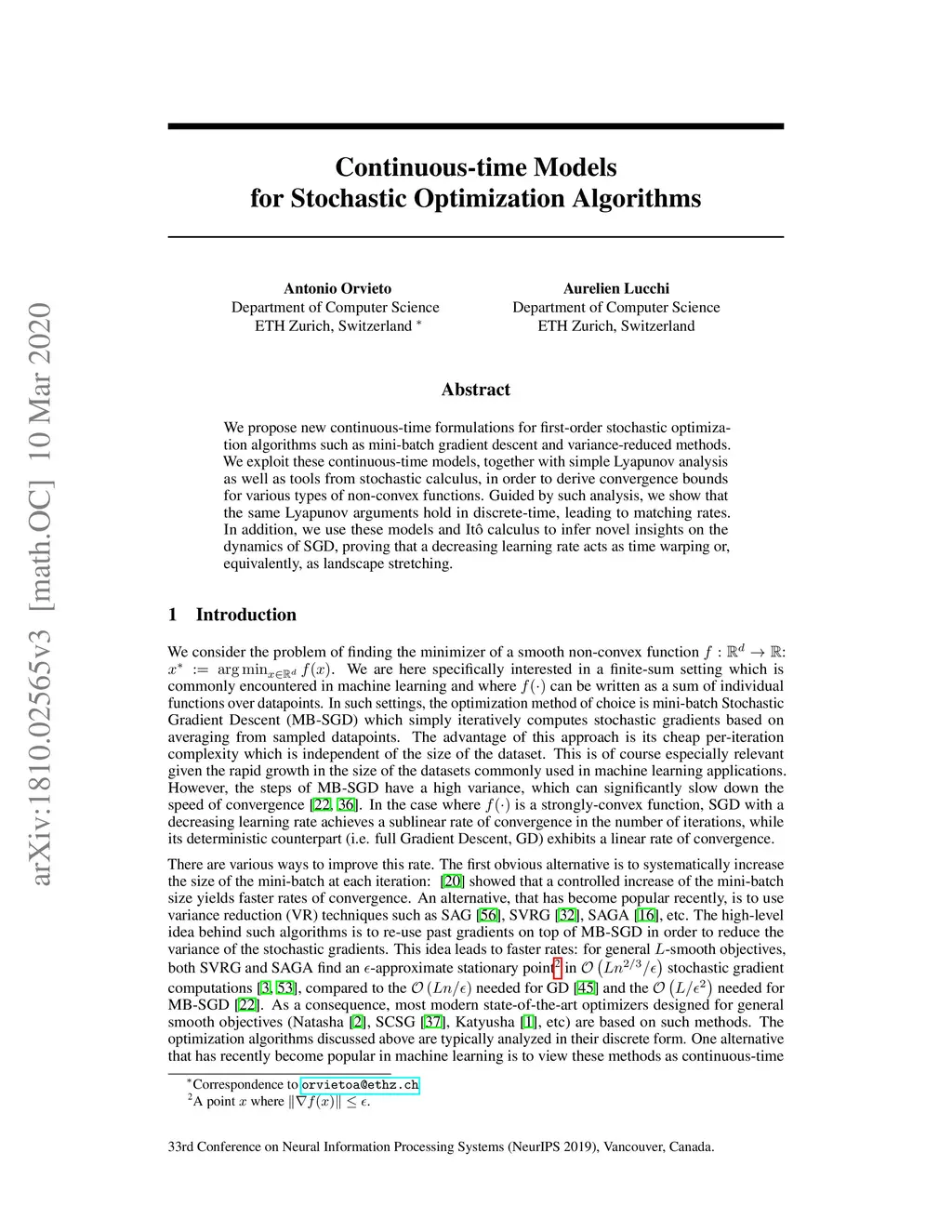 We propose new continuous-time formulations for first-order stochastic optimization algorithms such as mini-batch gradient descent and variance-reduced methods. We exploit these continuous-time models, together with simple Lyapunov analysis as well as tools from stochastic calculus, in order to derive convergence bounds for various types of non-convex functions. Guided by such analysis, we show that the same Lyapunov arguments hold in discrete-time, leading to matching rates. In addition, we use these models and Ito calculus to infer novel insights on the dynamics of SGD, proving that a decreasing learning rate acts as time warping or, equivalently, as landscape stretching.