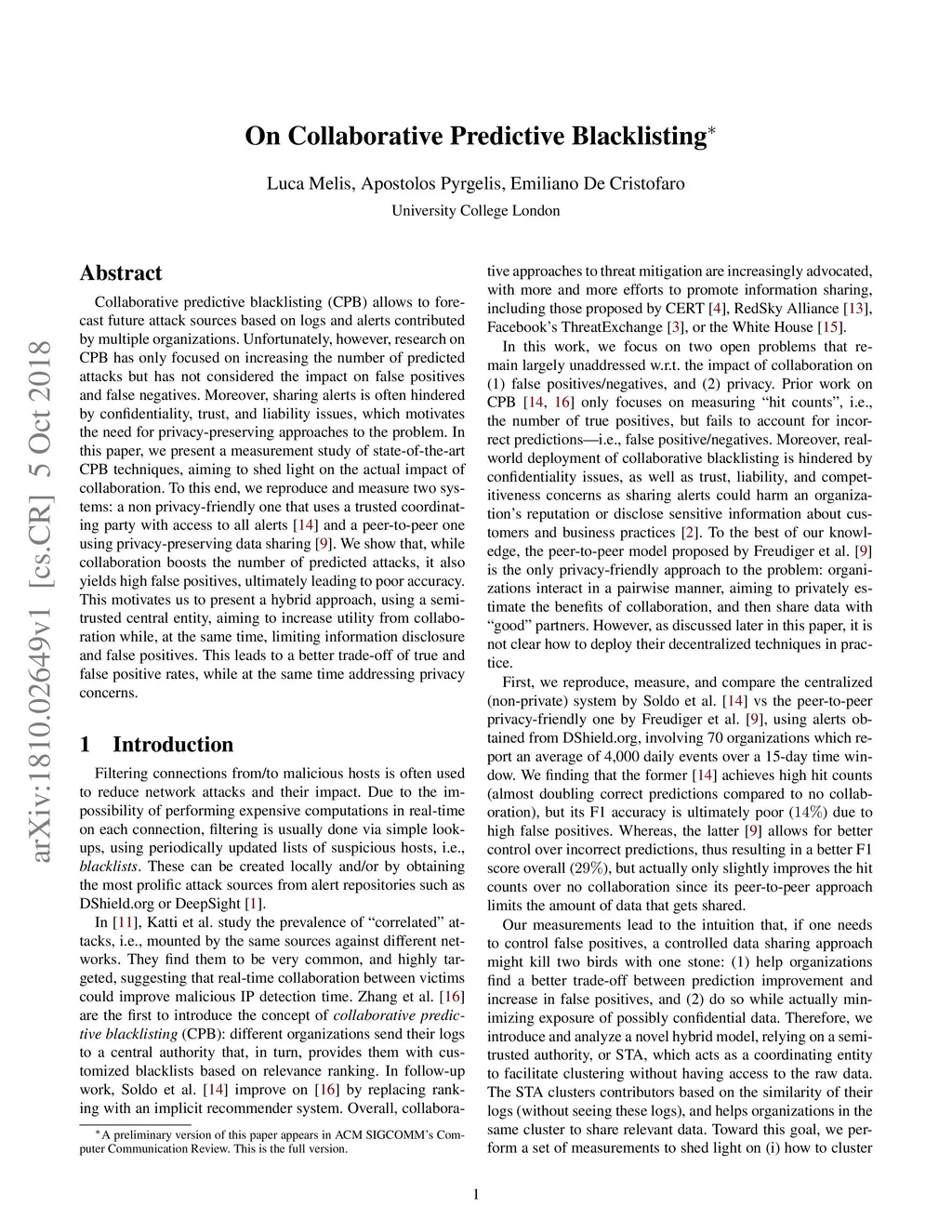 Collaborative predictive blacklisting (CPB) allows to forecast future attack sources based on logs and alerts contributed by multiple organizations. Unfortunately, however, research on CPB has only focused on increasing the number of predicted attacks but has not considered the impact on false positives and false negatives. Moreover, sharing alerts is often hindered by confidentiality, trust, and liability issues, which motivates the need for privacy-preserving approaches to the problem. In this paper, we present a measurement study of state-of-the-art CPB techniques, aiming to shed light on the actual impact of collaboration. To this end, we reproduce and measure two systems: a non privacy-friendly one that uses a trusted coordinating party with access to all alerts (Soldo et al., 2010) and a peer-to-peer one using privacy-preserving data sharing (Freudiger et al., 2015). We show that, while collaboration boosts the number of predicted attacks, it also yields high false positives, ultimately leading to poor accuracy. This motivates us to present a hybrid approach, using a semi-trusted central entity, aiming to increase utility from collaboration while, at the same time, limiting information disclosure and false positives. This leads to a better trade-off of true and false positive rates, while at the same time addressing privacy concerns.
