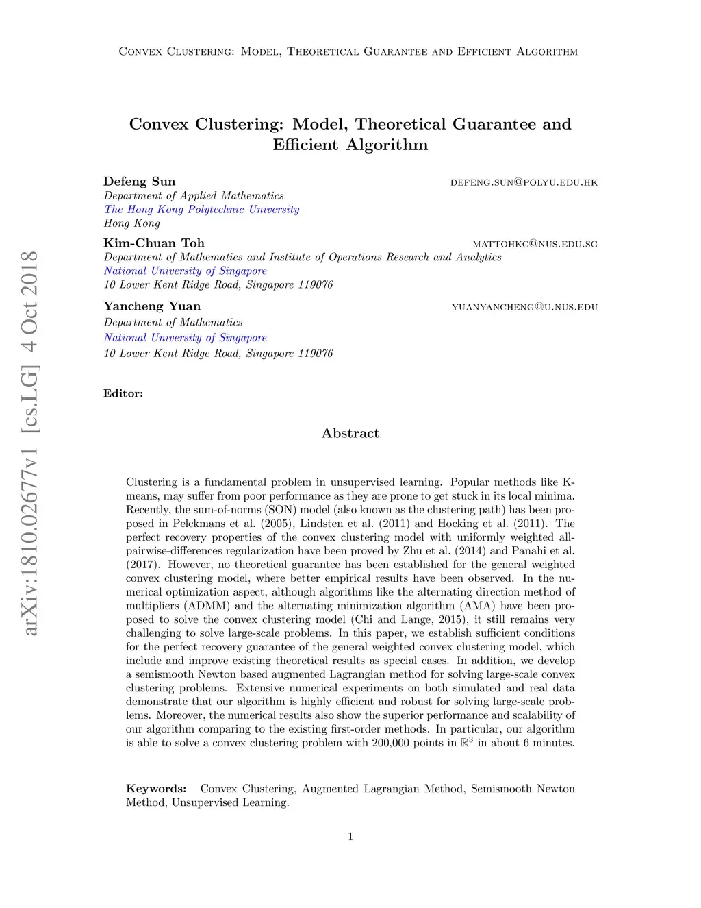 Clustering is a fundamental problem in unsupervised learning. Popular methods like K-means, may suffer from poor performance as they are prone to get stuck in its local minima. Recently, the sum-of-norms (SON) model (also known as the clustering path) has been proposed in Pelckmans et al. (2005), Lindsten et al. (2011) and Hocking et al. (2011). The perfect recovery properties of the convex clustering model with uniformly weighted all pairwise-differences regularization have been proved by Zhu et al. (2014) and Panahi et al. (2017). However, no theoretical guarantee has been established for the general weighted convex clustering model, where better empirical results have been observed. In the numerical optimization aspect, although algorithms like the alternating direction method of multipliers (ADMM) and the alternating minimization algorithm (AMA) have been proposed to solve the convex clustering model (Chi and Lange, 2015), it still remains very challenging to solve large-scale problems. In this paper, we establish sufficient conditions for the perfect recovery guarantee of the general weighted convex clustering model, which include and improve existing theoretical results as special cases. In addition, we develop a semismooth Newton based augmented Lagrangian method for solving large-scale convex clustering problems. Extensive numerical experiments on both simulated and real data demonstrate that our algorithm is highly efficient and robust for solving large-scale problems. Moreover, the numerical results also show the superior performance and scalability of our algorithm comparing to the existing first-order methods. In particular, our algorithm is able to solve a convex clustering problem with 200,000 points in in about 6 minutes.