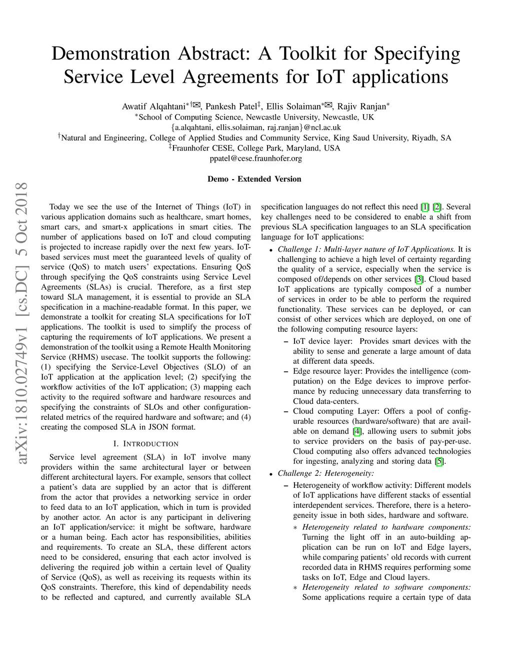 Today we see the use of the Internet of Things (IoT) in various application domains such as healthcare, smart homes, smart cars, and smart-x applications in smart cities. The number of applications based on IoT and cloud computing is projected to increase rapidly over the next few years. IoT-based services must meet the guaranteed levels of quality of service (QoS) to match users' expectations. Ensuring QoS through specifying the QoS constraints using Service Level Agreements (SLAs) is crucial. Therefore, as a first step toward SLA management, it is essential to provide an SLA specification in a machine-readable format. In this paper, we demonstrate a toolkit for creating SLA specifications for IoT applications. The toolkit is used to simplify the process of capturing the requirements of IoT applications. We present a demonstration of the toolkit using a Remote Health Monitoring Service (RHMS) usecase. The toolkit supports the following: (1) specifying the Service-Level Objectives (SLO) of an IoT application at the application level; (2) specifying the workflow activities of the IoT application; (3) mapping each activity to the required software and hardware resources and specifying the constraints of SLOs and other configuration- related metrics of the required hardware and software; and (4) creating the composed SLA in JSON format.