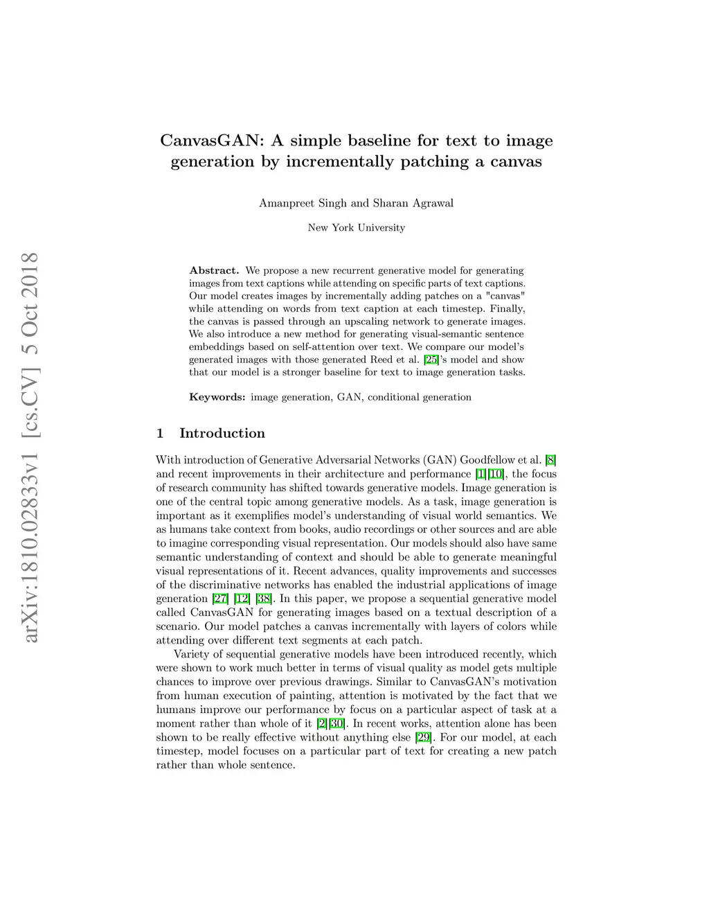 We propose a new recurrent generative model for generating images from text captions while attending on specific parts of text captions. Our model creates images by incrementally adding patches on a "canvas" while attending on words from text caption at each timestep. Finally, the canvas is passed through an upscaling network to generate images. We also introduce a new method for generating visual-semantic sentence embeddings based on self-attention over text. We compare our model's generated images with those generated Reed et. al.'s model and show that our model is a stronger baseline for text to image generation tasks.