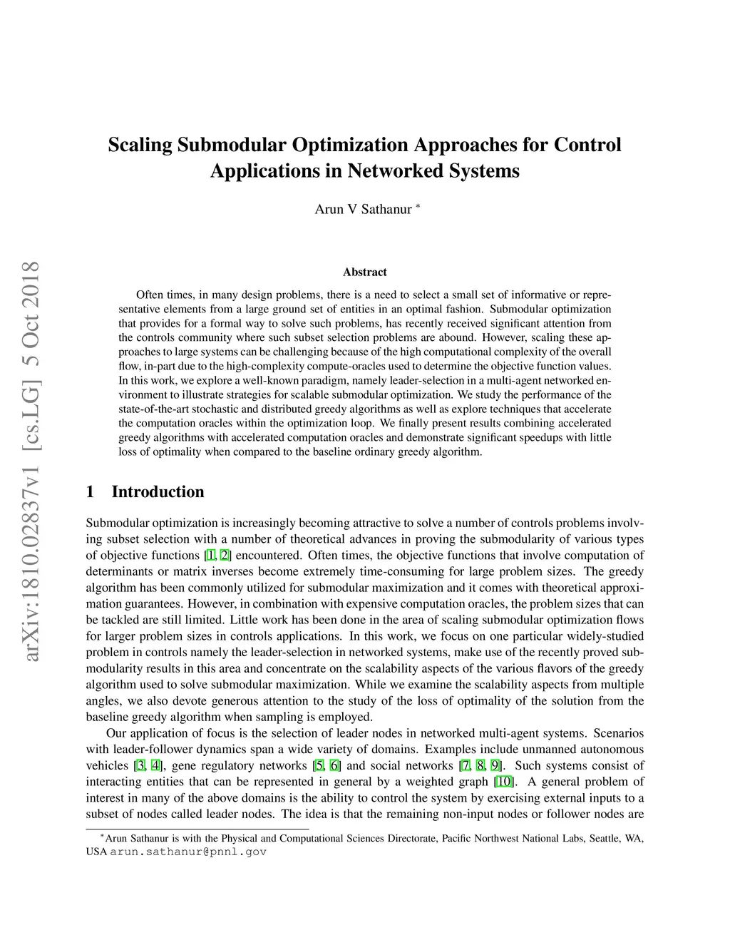 Often times, in many design problems, there is a need to select a small set of informative or representative elements from a large ground set of entities in an optimal fashion. Submodular optimization that provides for a formal way to solve such problems, has recently received significant attention from the controls community where such subset selection problems are abound. However, scaling these approaches to large systems can be challenging because of the high computational complexity of the overall flow, in-part due to the high-complexity compute-oracles used to determine the objective function values. In this work, we explore a well-known paradigm, namely leader-selection in a multi-agent networked environment to illustrate strategies for scalable submodular optimization. We study the performance of the state-of-the-art stochastic and distributed greedy algorithms as well as explore techniques that accelerate the computation oracles within the optimization loop. We finally present results combining accelerated greedy algorithms with accelerated computation oracles and demonstrate significant speedups with little loss of optimality when compared to the baseline ordinary greedy algorithm.