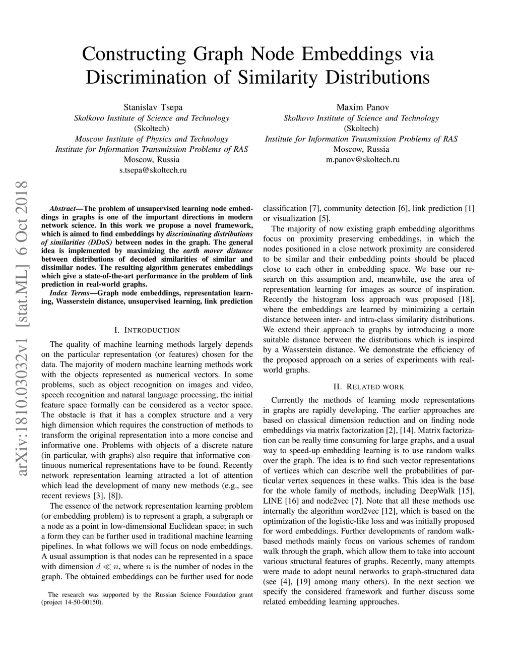 The problem of unsupervised learning node embeddings in graphs is one of the important directions in modern network science. In this work we propose a novel framework, which is aimed to find embeddings by \textit{discriminating distributions of similarities (DDoS)} between nodes in the graph. The general idea is implemented by maximizing the \textit{earth mover distance} between distributions of decoded similarities of similar and dissimilar nodes. The resulting algorithm generates embeddings which give a state-of-the-art performance in the problem of link prediction in real-world graphs.