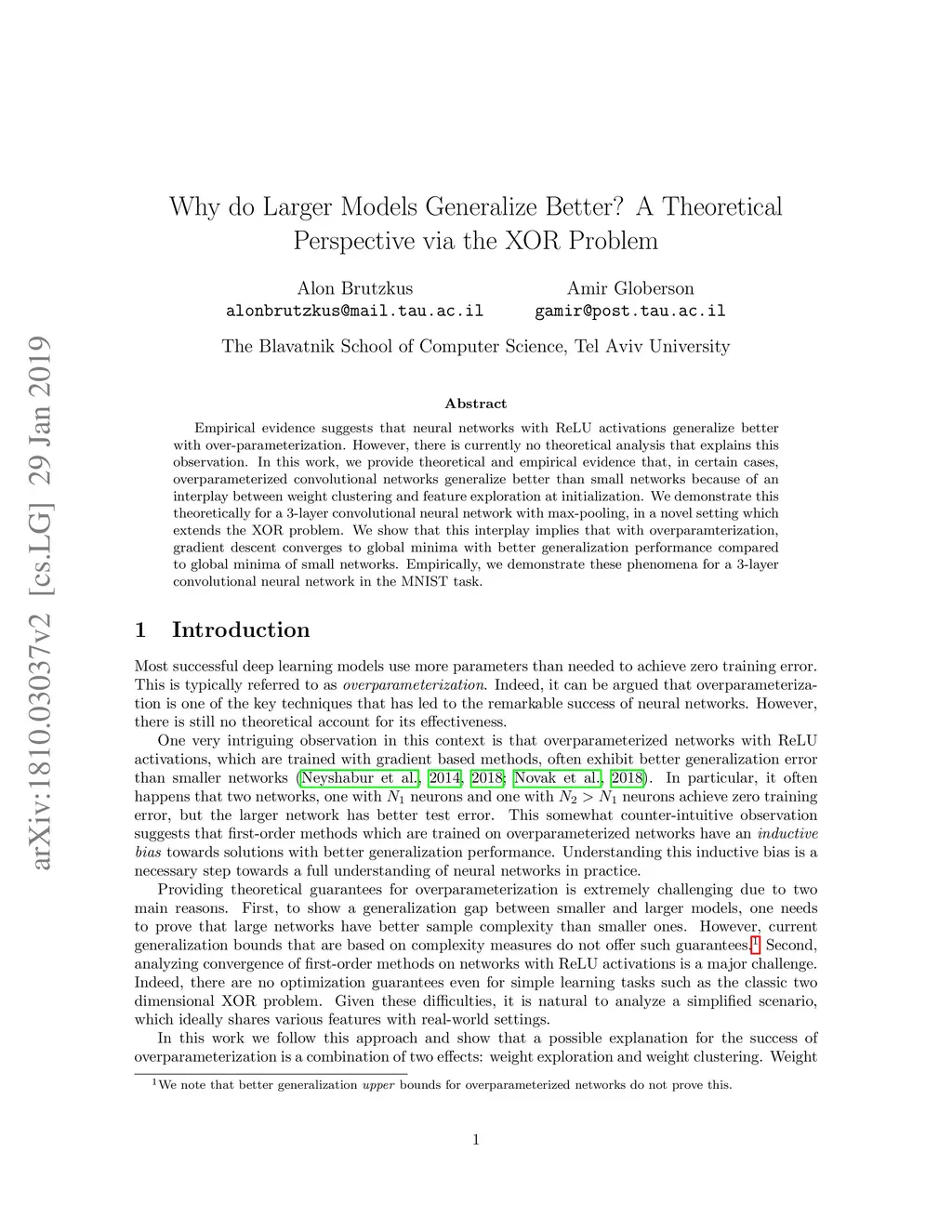 Empirical evidence suggests that neural networks with ReLU activations generalize better with over-parameterization. However, there is currently no theoretical analysis that explains this observation. In this work, we provide theoretical and empirical evidence that, in certain cases, overparameterized convolutional networks generalize better than small networks because of an interplay between weight clustering and feature exploration at initialization. We demonstrate this theoretically for a 3-layer convolutional neural network with max-pooling, in a novel setting which extends the XOR problem. We show that this interplay implies that with overparamterization, gradient descent converges to global minima with better generalization performance compared to global minima of small networks. Empirically, we demonstrate these phenomena for a 3-layer convolutional neural network in the MNIST task.