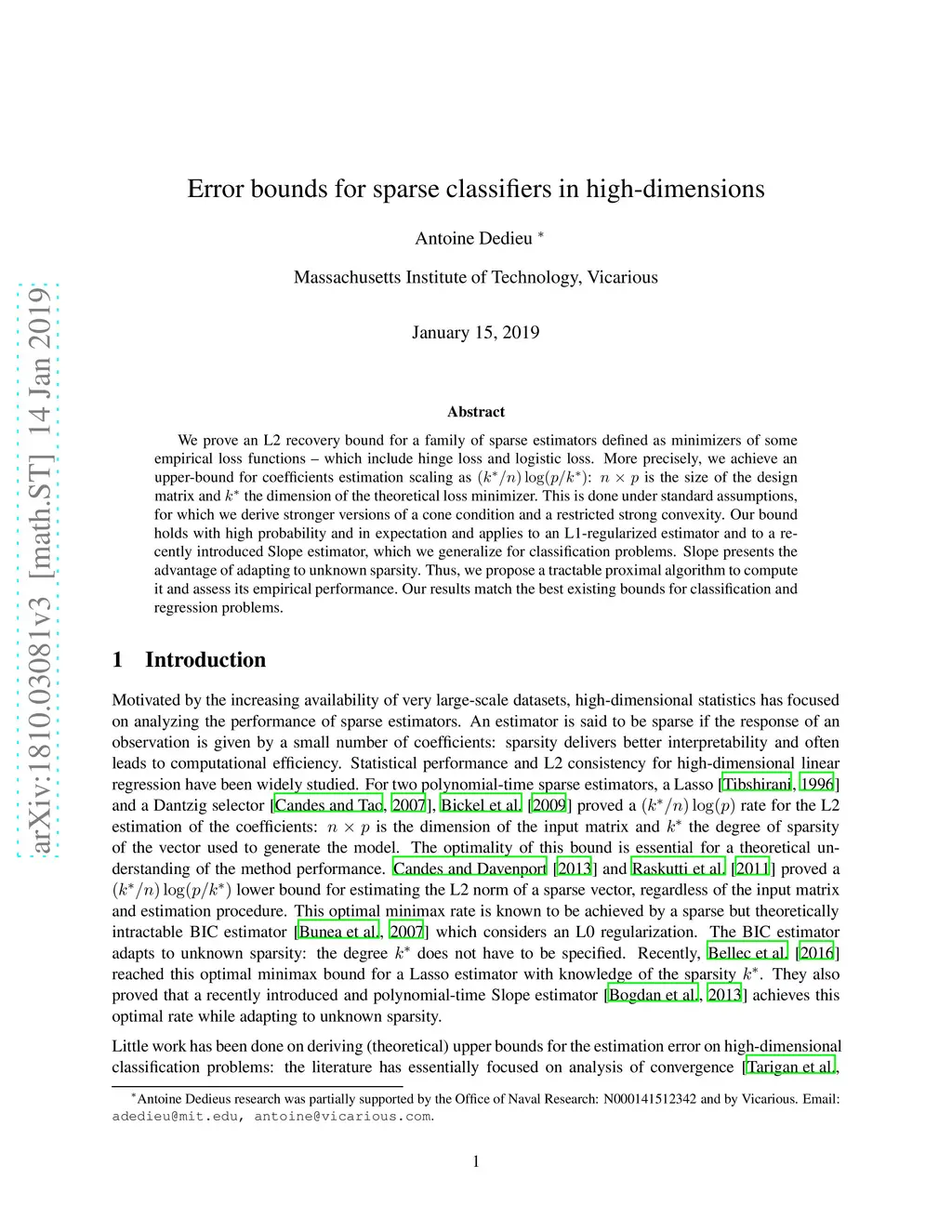 We prove an L2 recovery bound for a family of sparse estimators defined as minimizers of some empirical loss functions -- which include hinge loss and logistic loss. More precisely, we achieve an upper-bound for coefficients estimation scaling as (k*/n)\log(p/k*): n,p is the size of the design matrix and k* the dimension of the theoretical loss minimizer. This is done under standard assumptions, for which we derive stronger versions of a cone condition and a restricted strong convexity. Our bound holds with high probability and in expectation and applies to an L1-regularized estimator and to a recently introduced Slope estimator, which we generalize for classification problems. Slope presents the advantage of adapting to unknown sparsity. Thus, we propose a tractable proximal algorithm to compute it and assess its empirical performance. Our results match the best existing bounds for classification and regression problems.