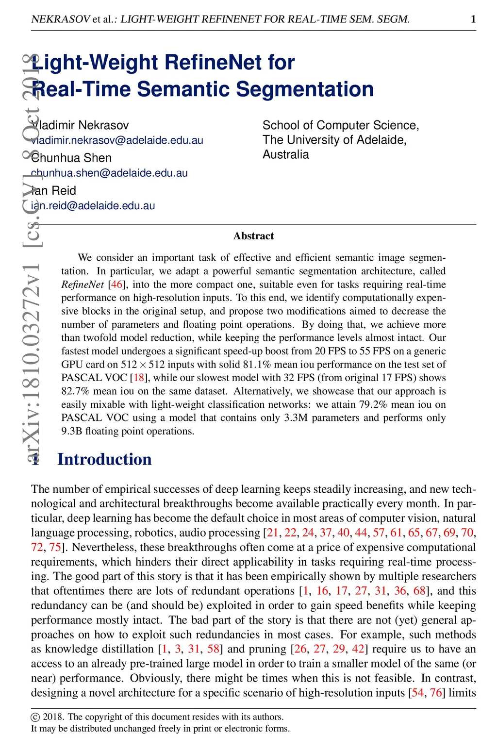 We consider an important task of effective and efficient semantic image segmentation. In particular, we adapt a powerful semantic segmentation architecture, called RefineNet, into the more compact one, suitable even for tasks requiring real-time performance on high-resolution inputs. To this end, we identify computationally expensive blocks in the original setup, and propose two modifications aimed to decrease the number of parameters and floating point operations. By doing that, we achieve more than twofold model reduction, while keeping the performance levels almost intact. Our fastest model undergoes a significant speed-up boost from 20 FPS to 55 FPS on a generic GPU card on 512x512 inputs with solid 81.1% mean iou performance on the test set of PASCAL VOC, while our slowest model with 32 FPS (from original 17 FPS) shows 82.7% mean iou on the same dataset. Alternatively, we showcase that our approach is easily mixable with light-weight classification networks: we attain 79.2% mean iou on PASCAL VOC using a model that contains only 3.3M parameters and performs only 9.3B floating point operations.