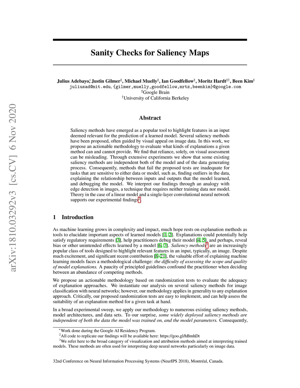 Saliency methods have emerged as a popular tool to highlight features in an input deemed relevant for the prediction of a learned model. Several saliency methods have been proposed, often guided by visual appeal on image data. In this work, we propose an actionable methodology to evaluate what kinds of explanations a given method can and cannot provide. We find that reliance, solely, on visual assessment can be misleading. Through extensive experiments we show that some existing saliency methods are independent both of the model and of the data generating process. Consequently, methods that fail the proposed tests are inadequate for tasks that are sensitive to either data or model, such as, finding outliers in the data, explaining the relationship between inputs and outputs that the model learned, and debugging the model. We interpret our findings through an analogy with edge detection in images, a technique that requires neither training data nor model. Theory in the case of a linear model and a single-layer convolutional neural network supports our experimental findings.