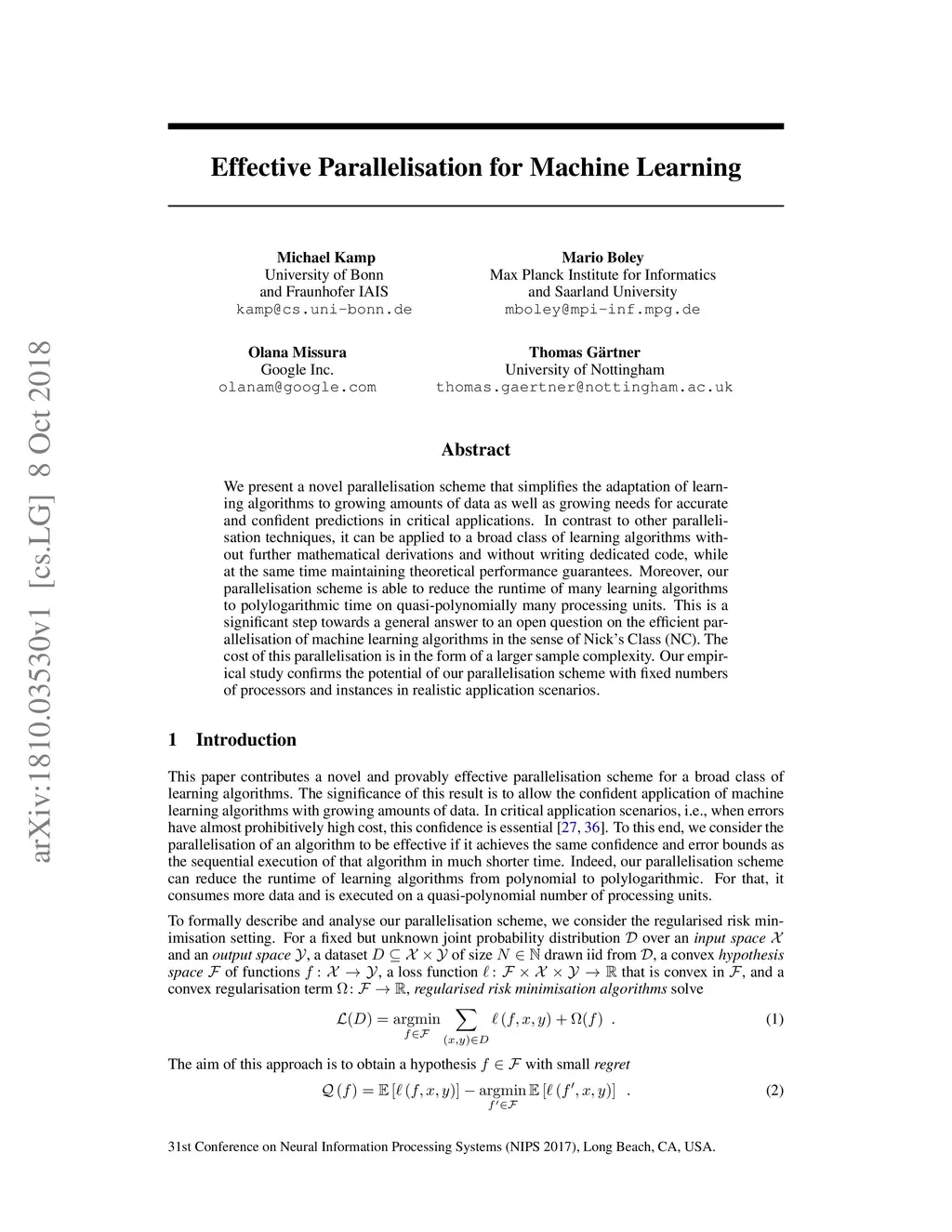 We present a novel parallelisation scheme that simplifies the adaptation of learning algorithms to growing amounts of data as well as growing needs for accurate and confident predictions in critical applications. In contrast to other parallelisation techniques, it can be applied to a broad class of learning algorithms without further mathematical derivations and without writing dedicated code, while at the same time maintaining theoretical performance guarantees. Moreover, our parallelisation scheme is able to reduce the runtime of many learning algorithms to polylogarithmic time on quasi-polynomially many processing units. This is a significant step towards a general answer to an open question on the efficient parallelisation of machine learning algorithms in the sense of Nick's Class (NC). The cost of this parallelisation is in the form of a larger sample complexity. Our empirical study confirms the potential of our parallelisation scheme with fixed numbers of processors and instances in realistic application scenarios.