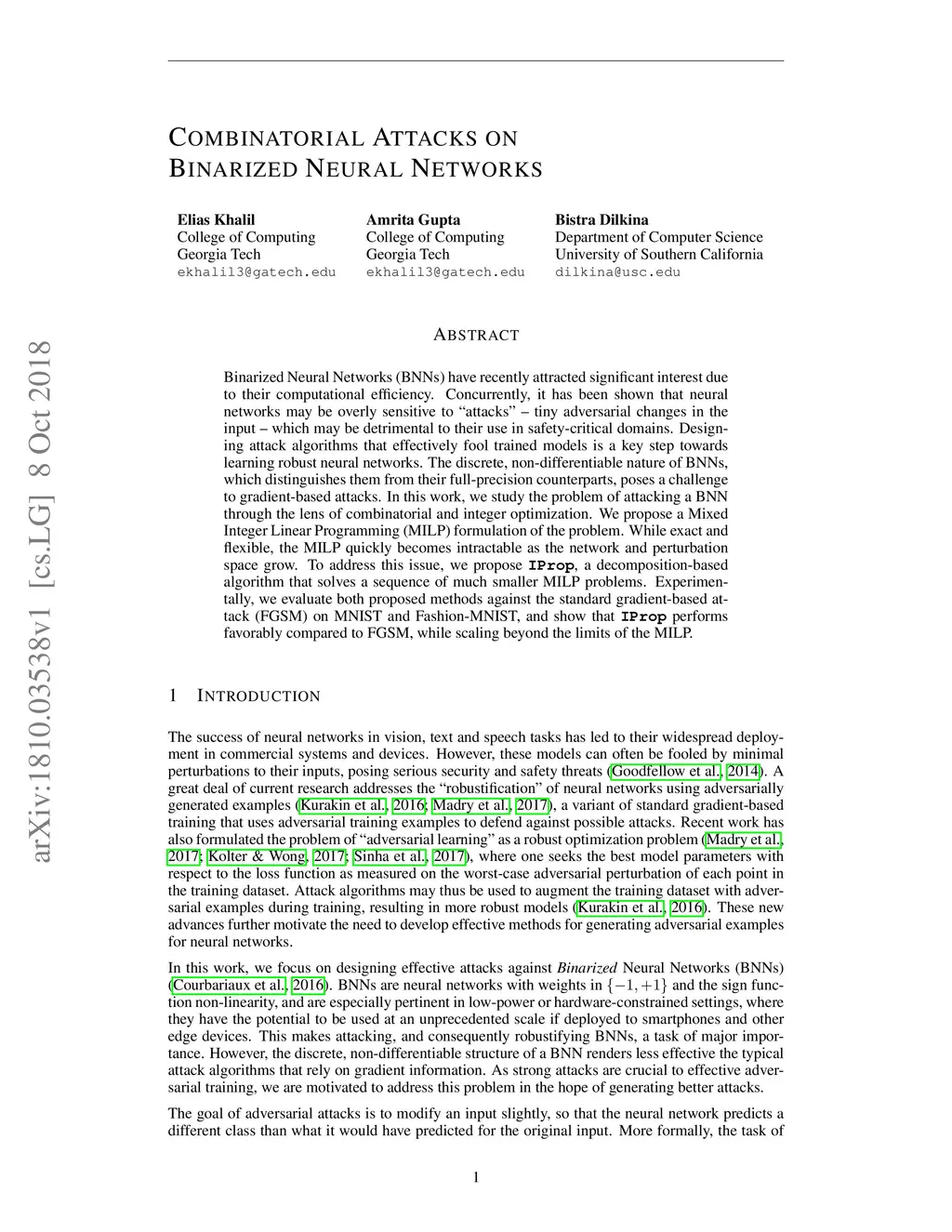 Combinatorial Attacks on Binarized Neural Networks