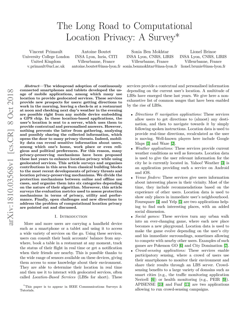 The widespread adoption of continuously connected smartphones and tablets developed the usage of mobile applications, among which many use location to provide geolocated services. These services provide new prospects for users: getting directions to work in the morning, leaving a check-in at a restaurant at noon and checking next day's weather in the evening are possible right from any mobile device embedding a GPS chip. In these location-based applications, the user's location is sent to a server, which uses them to provide contextual and personalised answers. However, nothing prevents the latter from gathering, analysing and possibly sharing the collected information, which opens the door to many privacy threats. Indeed, mobility data can reveal sensitive information about users, among which one's home, work place or even religious and political preferences. For this reason, many privacy-preserving mechanisms have been proposed these last years to enhance location privacy while using geolocated services. This article surveys and organises contributions in this area from classical building blocks to the most recent developments of privacy threats and location privacy-preserving mechanisms. We divide the protection mechanisms between online and offline use cases, and organise them into six categories depending on the nature of their algorithm. Moreover, this article surveys the evaluation metrics used to assess protection mechanisms in terms of privacy, utility and performance. Finally, open challenges and new directions to address the problem of computational location privacy are pointed out and discussed.