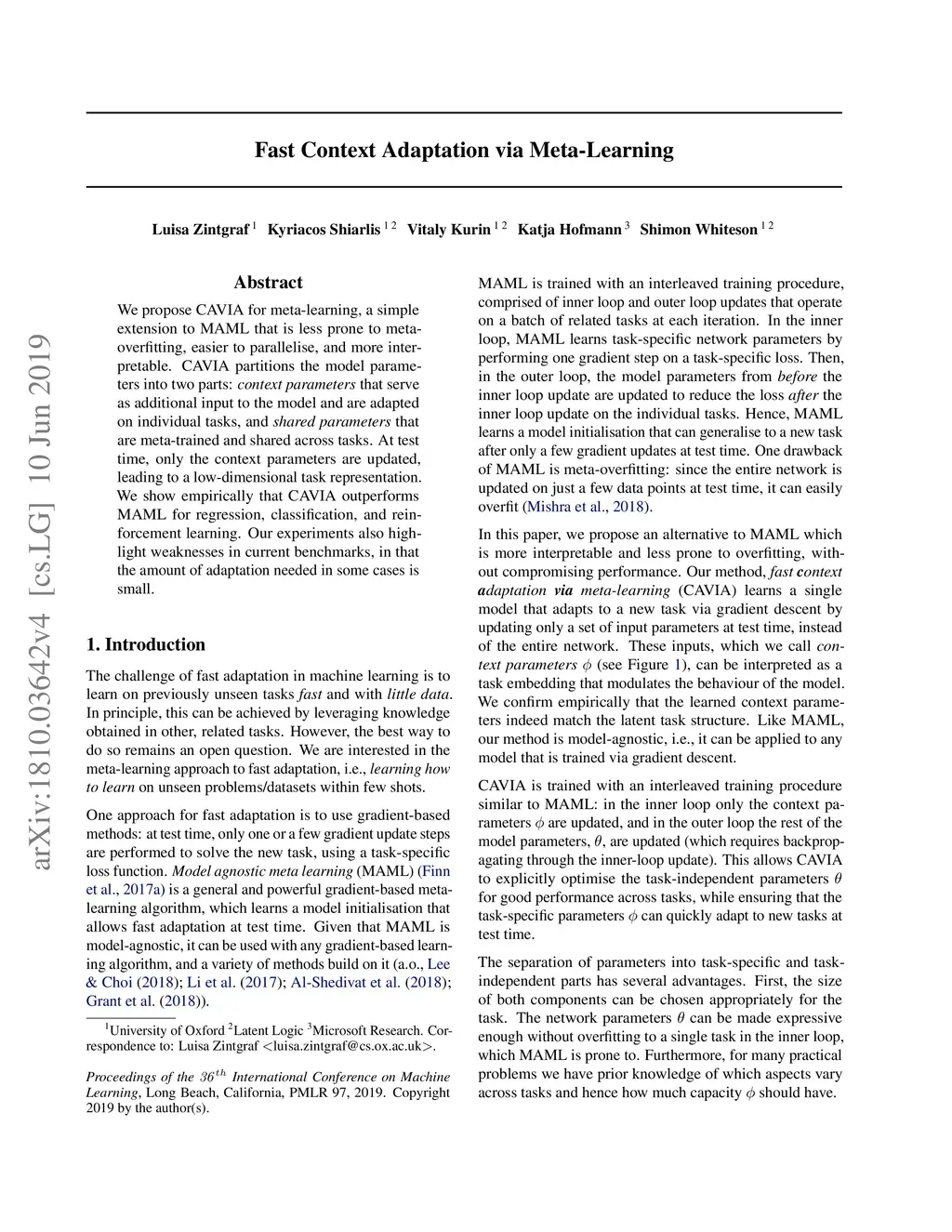 We propose CAVIA for meta-learning, a simple extension to MAML that is less prone to meta-overfitting, easier to parallelise, and more interpretable. CAVIA partitions the model parameters into two parts: context parameters that serve as additional input to the model and are adapted on individual tasks, and shared parameters that are meta-trained and shared across tasks. At test time, only the context parameters are updated, leading to a low-dimensional task representation. We show empirically that CAVIA outperforms MAML for regression, classification, and reinforcement learning. Our experiments also highlight weaknesses in current benchmarks, in that the amount of adaptation needed in some cases is small.