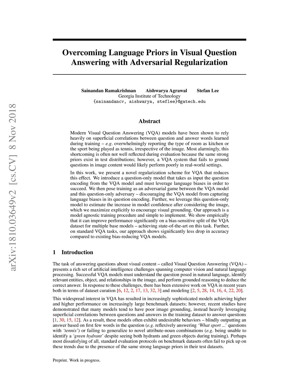 Overcoming Language Priors in Visual Question Answering with Adversarial