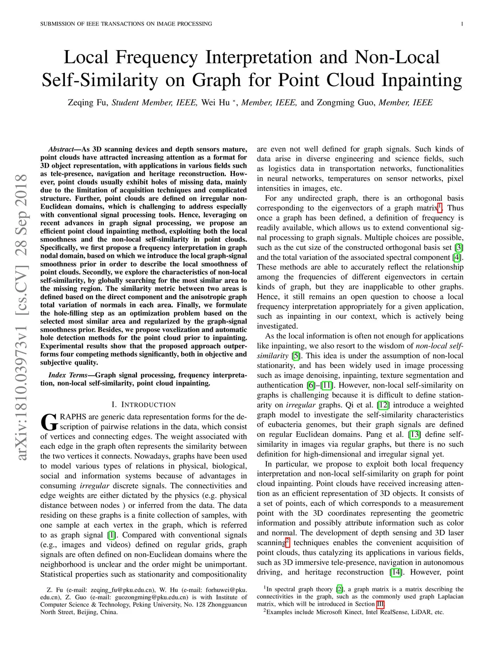 As 3D scanning devices and depth sensors mature, point clouds have attracted increasing attention as a format for 3D object representation, with applications in various fields such as tele-presence, navigation and heritage reconstruction. However, point clouds usually exhibit holes of missing data, mainly due to the limitation of acquisition techniques and complicated structure. Further, point clouds are defined on irregular non-Euclidean domains, which is challenging to address especially with conventional signal processing tools. Hence, leveraging on recent advances in graph signal processing, we propose an efficient point cloud inpainting method, exploiting both the local smoothness and the non-local self-similarity in point clouds. Specifically, we first propose a frequency interpretation in graph nodal domain, based on which we introduce the local graph-signal smoothness prior in order to describe the local smoothness of point clouds. Secondly, we explore the characteristics of non-local self-similarity, by globally searching for the most similar area to the missing region. The similarity metric between two areas is defined based on the direct component and the anisotropic graph total variation of normals in each area. Finally, we formulate the hole-filling step as an optimization problem based on the selected most similar area and regularized by the graph-signal smoothness prior. Besides, we propose voxelization and automatic hole detection methods for the point cloud prior to inpainting. Experimental results show that the proposed approach outperforms four competing methods significantly, both in objective and subjective quality.